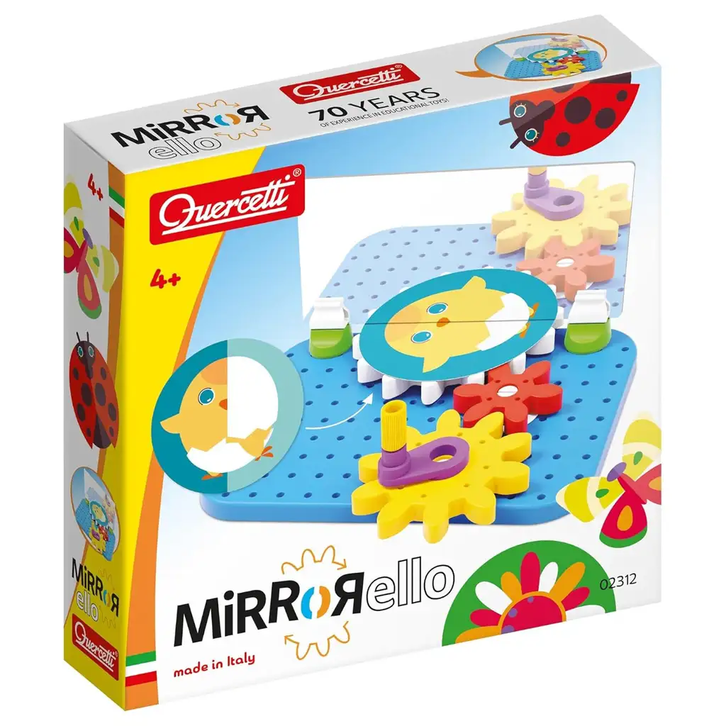 Quercetti Mirrorello je posebna igrača z zobniki za razvoj spretnosti, ki na kreativen način uči otroke osnovne principe mehanike in čarobni svet odsevov. Cilj igre je, da majhni otroci iz barvnih zobnikov zgradijo svoje stvaritve in nato opazujejo, kako oživijo s pomočjo ogledala. Ta posebna mehanska igrača ni le zabavna, ampak tudi razvija logično razmišljanje, sposobnost reševanja problemov in fine motorične spretnosti.