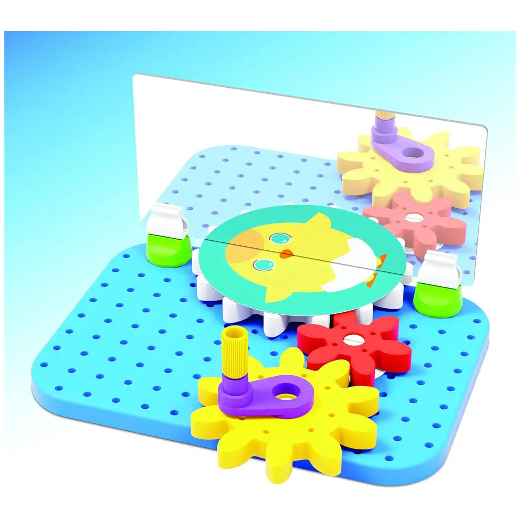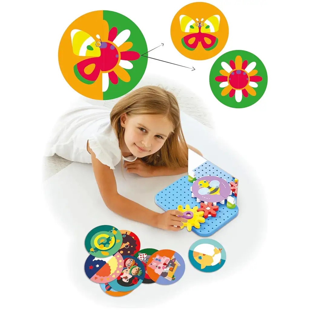 Ta igrača je še posebej priporočljiva za otroke, starejše od 4 let, saj je enostavna za sestavljanje, a skriva veliko možnosti za odkrivanje. Pravilna razporeditev zobnikov in njihovo delovanje pomaga pri razvoju logičnih spretnosti, medtem ko uporaba ogledala ponuja novo perspektivo za prostorsko zaznavanje. Žive barve in ljubki vzorci igre jo naredijo še bolj privlačno za otroke, zato zagotovo dolgo časa pritegne njihovo pozornost.