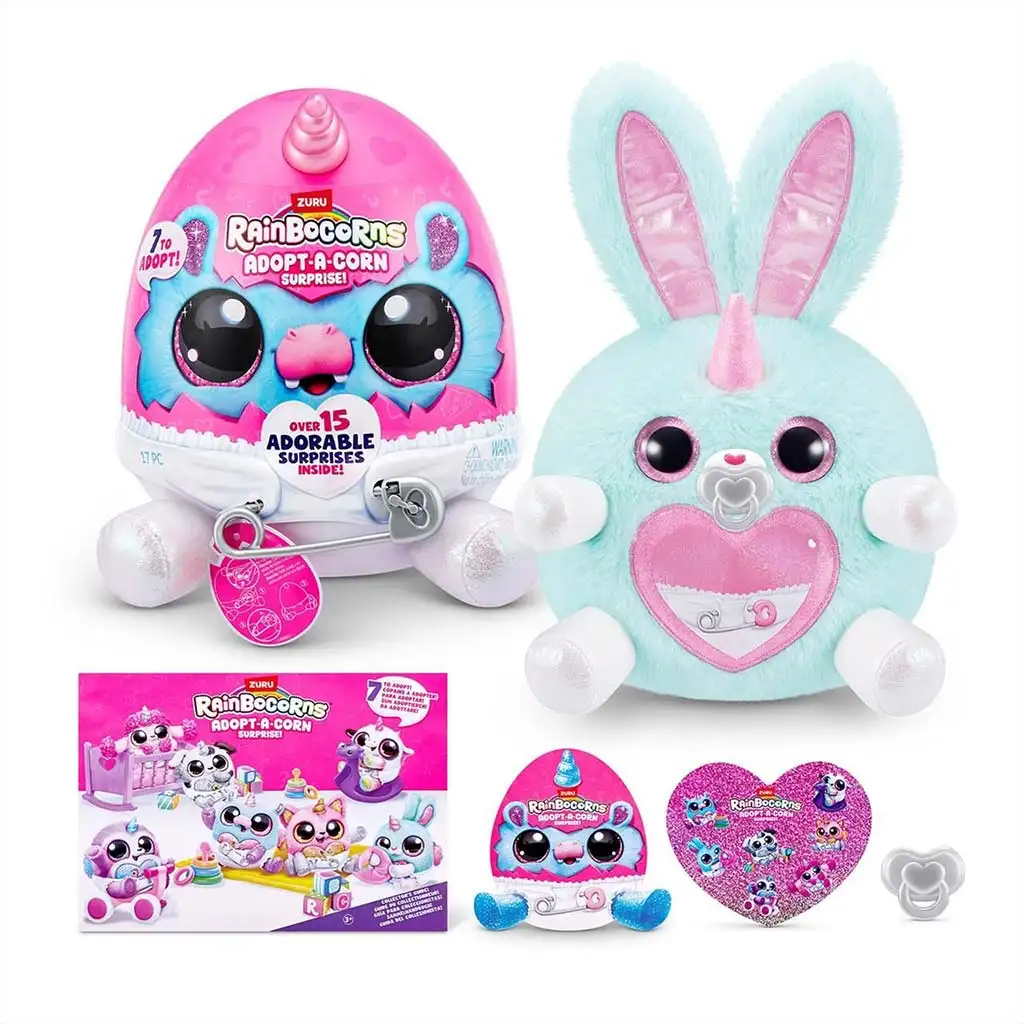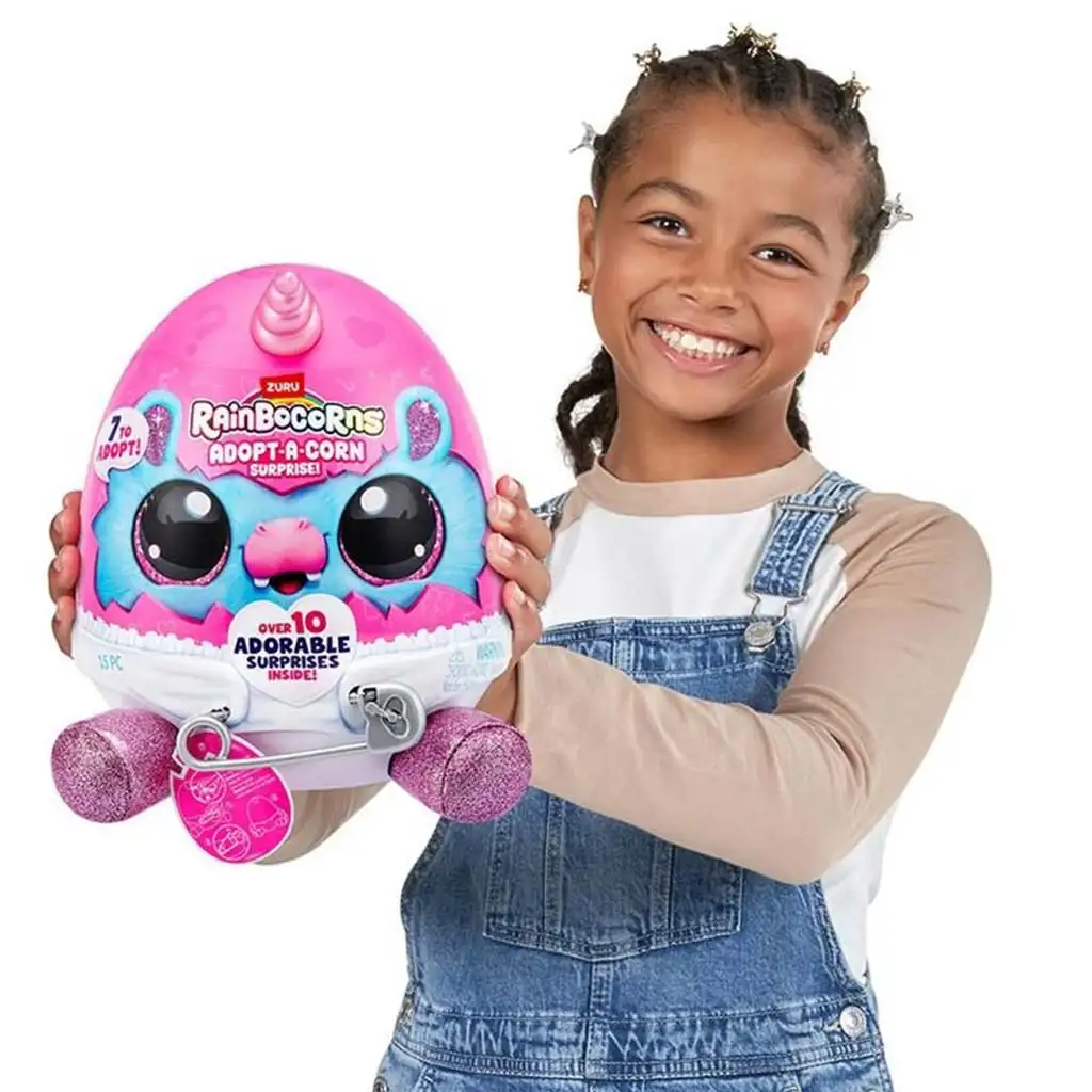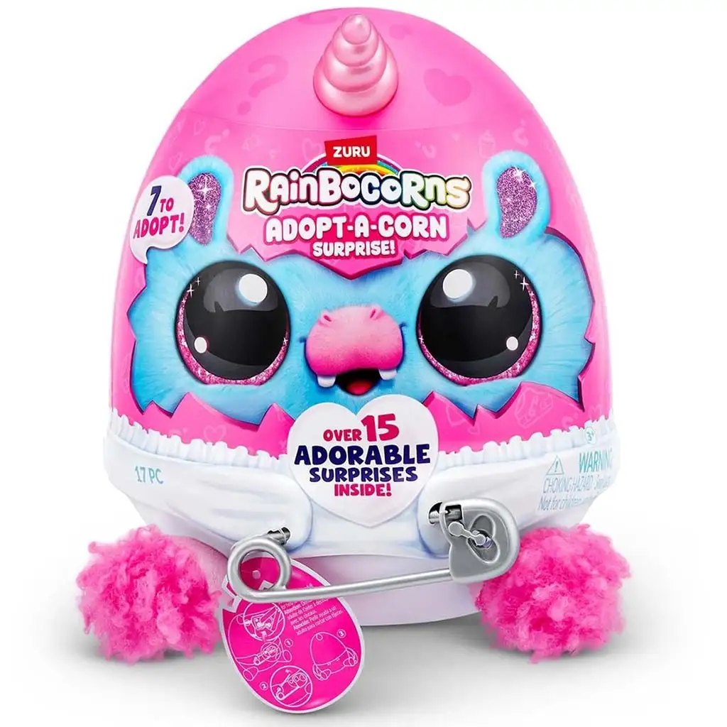 Rainbocorns: Adopt-a-Corn preseneča plišasta figura nudi otrokom resnično posebno igralno izkušnjo! Paket je skrit v velikem presenečenju jajcu, in ko ga odpreš, te čaka ljubka mala plišasta figura samoroga, ki bo takoj postala tvoj najboljši prijatelj. Te mehke, squishy figure so popolne za objemanje in domišljijsko igro.