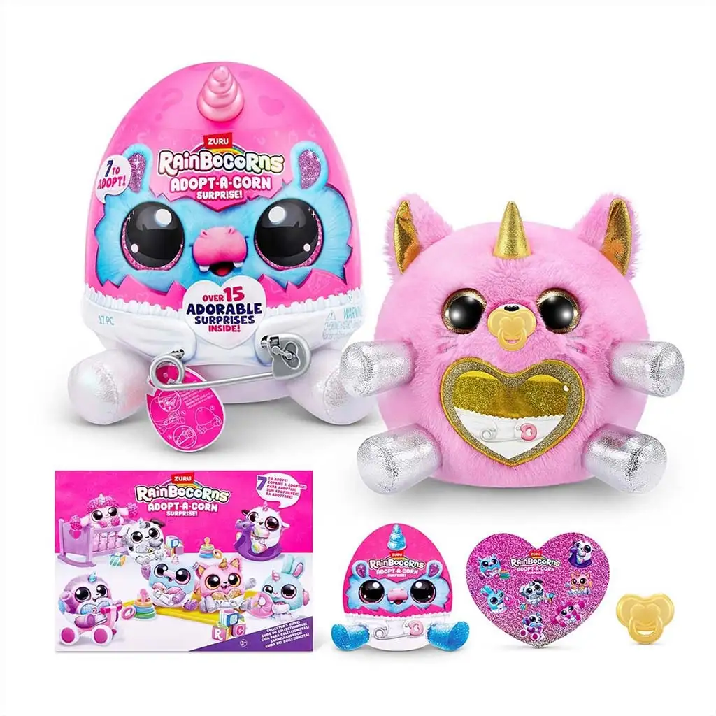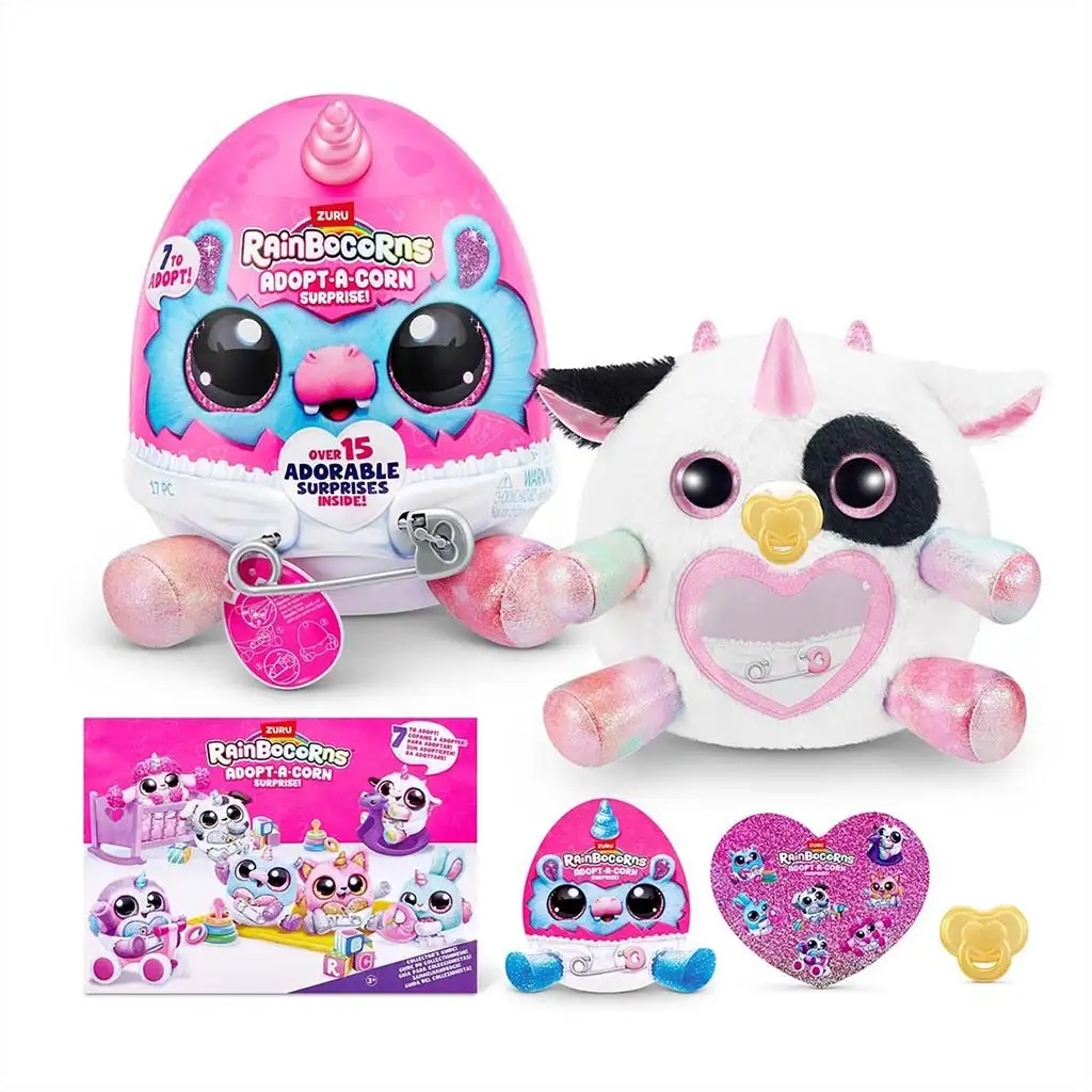 V seriji Rainbocorns: Adopt-a-Corn je mogoče zbrati sedem različnih plišastih malih samorogov, tako da lahko vsakdo najde svojega najljubšega. Figure imajo edinstven videz in vsaka ima svoj stil, barvno shemo in okraske, kar zbiranje naredi še bolj razburljivo. Te male figure so popolne za to, da otroci ustvarijo svoj mali domišljijski svet, medtem ko skrbijo za svojega posvojenega malega samoroga.