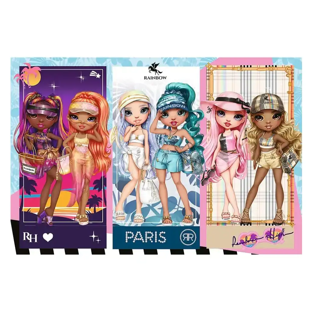 Izjemno modne punce Rainbow High vas bodo zagotovo navdušile. Ta pisana sestavljanka prikazuje kul dekleta v najbolj barvitih in najbolj modnih oblačilih. Slika je razdeljena na tri dele, v vsakem prizoru lahko vidimo po dve punci Rainbow High. Trefl-ove vrhunske sestavljanke zaradi svoje čudovite, barvite in ostre tiskovine izjemno podrobno prikazujejo sliko, ki jo sestavljate. Posamezni deli sestavljanke se natančno in precizno prilegajo drug drugemu in po sestavljanju ustvarijo lepo, homogeno površino slike.