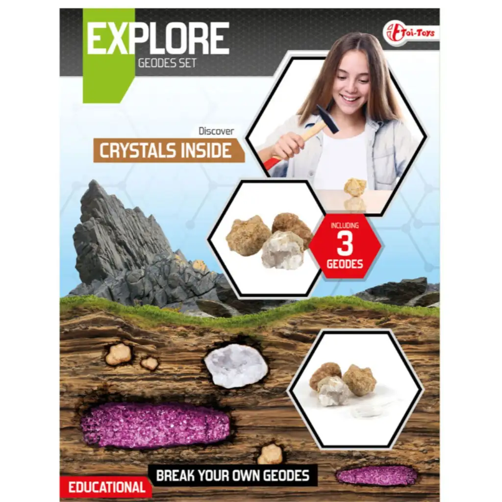 Raziskovalni komplet Explore Geodák je vznemirljiva, poučna igra, ki mlade raziskovalce popelje v svet geologije. Komplet vsebuje tri prave geode, ki jih otroci lahko sami razbijejo, da odkrijejo bleščeče kristale v njihovi notranjosti. Z uporabo kladiva in povečevalnega stekla se otroci lahko počutijo kot pravi arheologi, medtem ko odkrivajo skrivnosti globin Zemlje. Igra ni le zabavna, ampak spodbuja tudi radovednost do narave in znanstveno razmišljanje. Popolna izbira za vse male znanstvenike, ki želijo spoznati fascinanten svet kristalov in se učiti skozi izkušnje!
