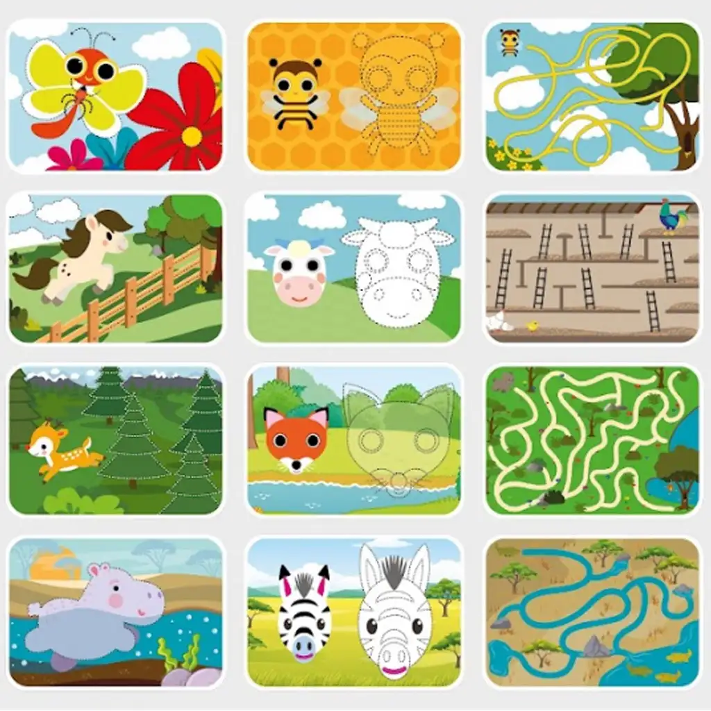V paketu boste našli 16 dvostranskih kartic z brisljivo površino, na katerih čakajo različne igrive naloge za otroke. S priloženim flomastrom, ki ga je mogoče brisati, lahko naloge rešujete znova in znova, zato bo ta komplet dolgoročno zabaven. Med nalogami so na primer risanje črt, povezovanje točk, labirinti in druge kreativne dejavnosti, ki vse prispevajo k razvoju otrok. Svet živali in preproste, a učinkovite naloge so popolne za to, da se otroci, stari 3 leta ali več, učijo na igriv način.