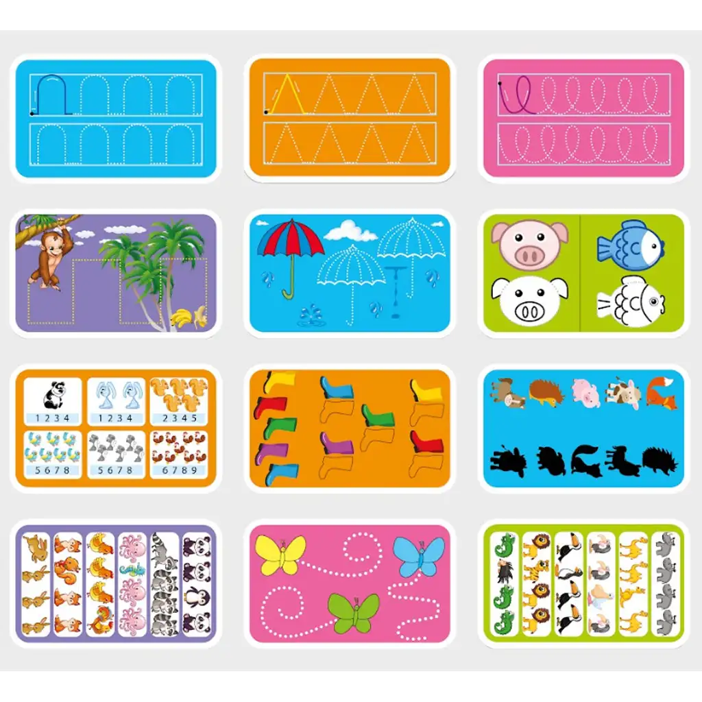 Paket vsebuje 12 dvostranskih, izbrisljivih kartic, ki ponujajo raznolike naloge. Otroci lahko izvajajo vaje za sledenje črtam, povezujejo oblike, prepoznavajo sence ali rešujejo preproste matematične naloge. Veseli ilustracije na karticah, kot so živali, barviti predmeti in zanimivi vzorci, zagotovo pritegnejo pozornost malčkov. S priloženim izbrisljivim flomastrom lahko naloge rešujejo znova in znova, kar zagotavlja dolgotrajno izkušnjo.