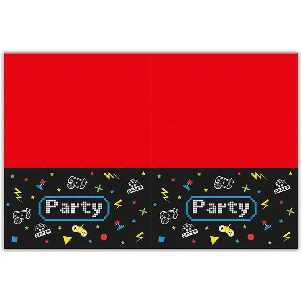 Popestrite prizorišče rojstnodnevne zabave s to spektakularno plastično prtom z motivom gamerja, ki je popolna izbira za vse male (in velike) ljubitelje iger! Kontrast živahne rdeče in črne barve takoj pritegne pozornost, medtem ko kontrolerji, joysticki, puščice, strele in pikseliziran napis "Party" na robu zagotavljajo igrivo vzdušje.