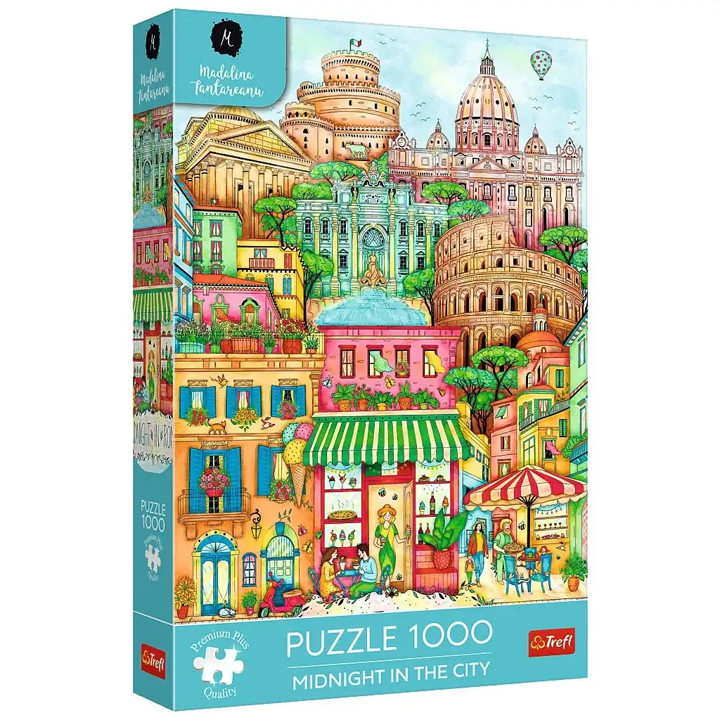 Odkrij čar večnega mesta s to posebno, 1000-delno sestavljanko, ki v edinstvenem, pravljičnem slogu Mădăline Tănăsăreanuja prikazuje najslavnejše znamenitosti Rima. Sestavljanka »Rim opolnoči« je prava paleta barv, ki hkrati prikliče zgodovinsko lepoto mesta in sredozemski način življenja. Na sliki prepoznaš Kolosej, baziliko svetega Petra, vodnjak Trevi, Angelski grad ter številne očarljive italijanske ulice, polne cvetja, stojnic s sladoledom, kavarn in slikovitih balkonov.