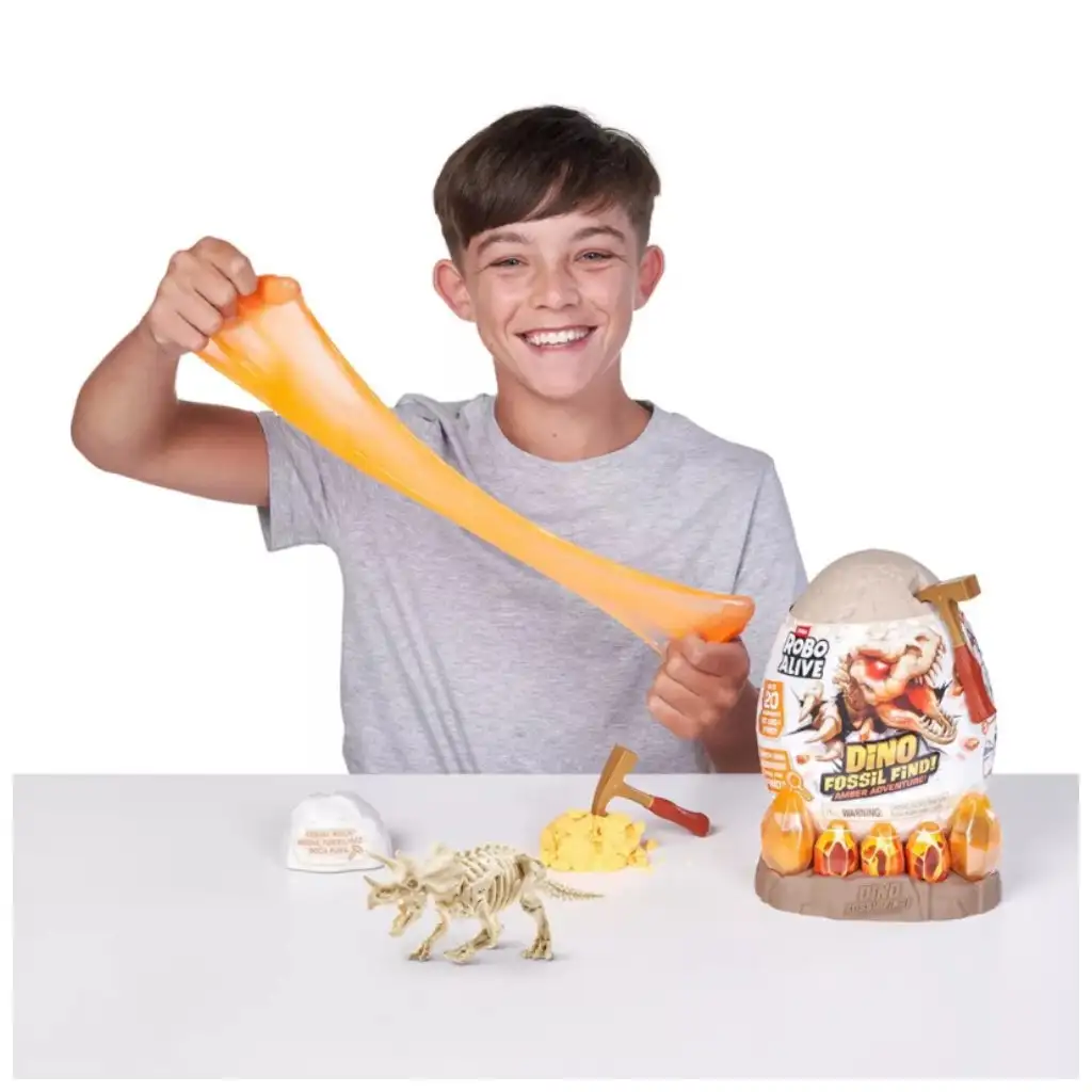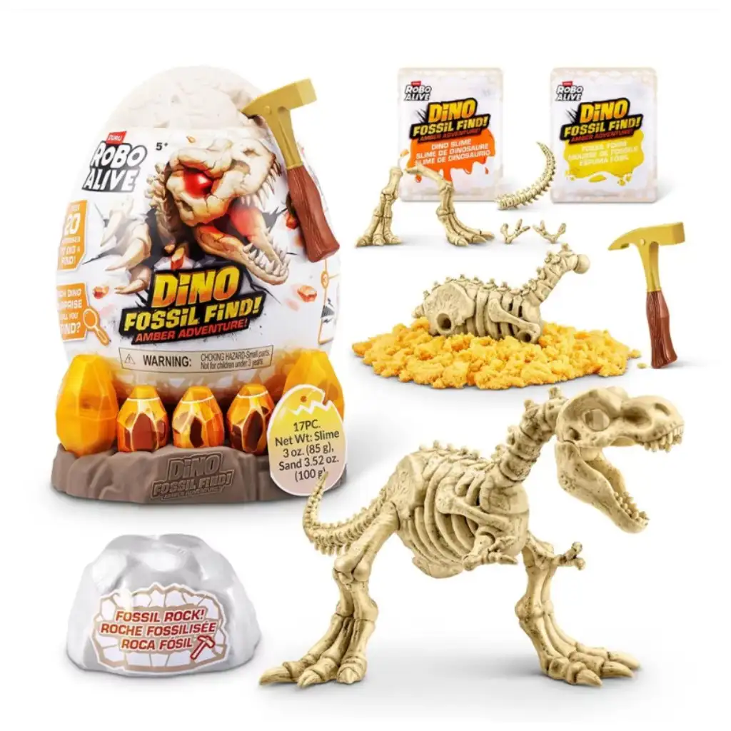 Odkrij skrivnosti preteklosti z Robo Alive dinozavrsko fosilijo – Jantarni pustolovski set! Pripravi se na razburljivo izkopavanje, kjer se boš moral prebiti skozi plasti kamnin in peska, da odkriješ starodavne ostanke dinozavra. Sluzasta lava je posebna popestritev pustolovščine: sveti, se razteza in naredi odkrivanje še bolj vznemirljivo.