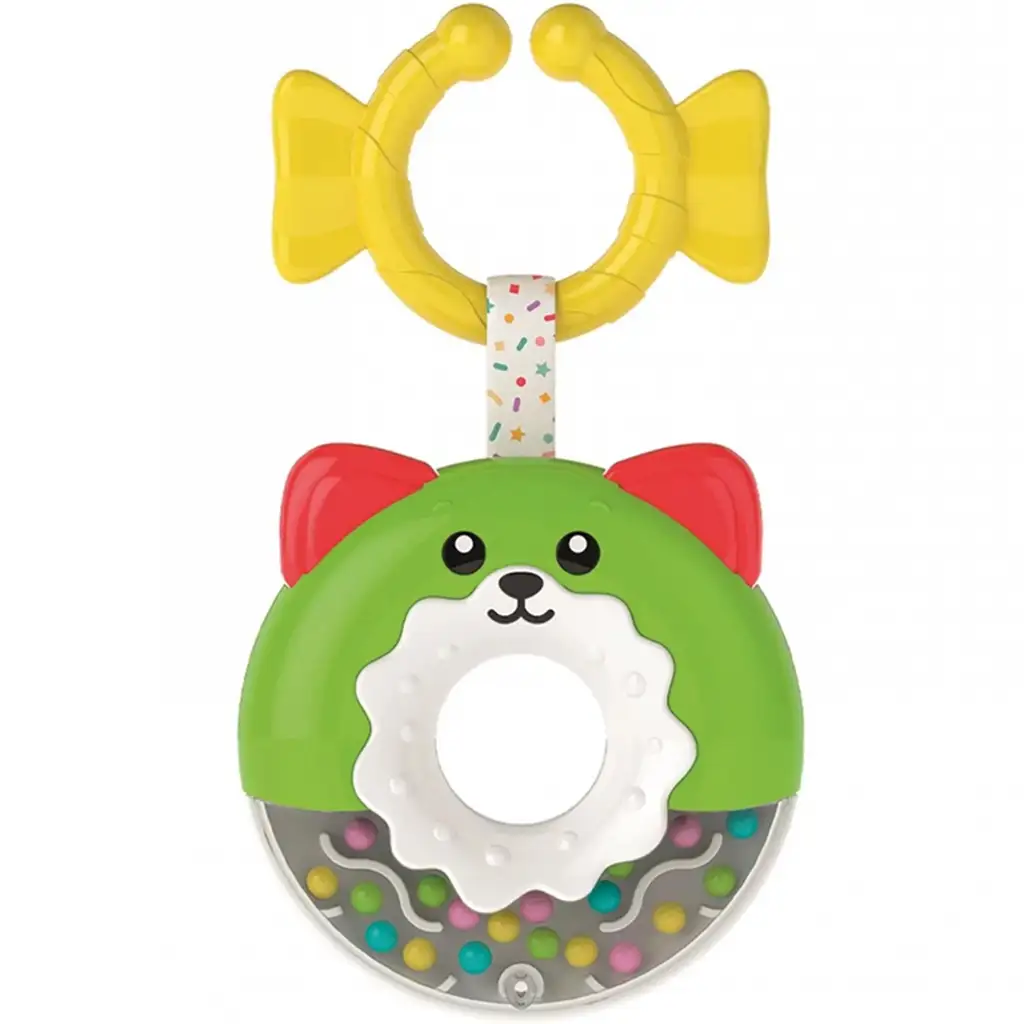 Ta igrača je idealen spremljevalec v zgodnjih razvojnih fazah: spodbuja razvoj sluha, vida, tipa in fine motorike. Poleg tega ljubek obrazek živali, ki se smeji na vrhu krofa, to igračo za male rokice naredi še bolj simpatično.