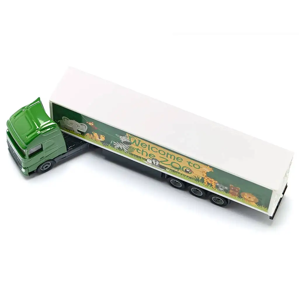 SIKU Volvo vlačilec s polpriklopnikom v merilu 1/87 je resnično poseben kos, ki ne prinaša veselja le ljubiteljem vozil, temveč spodbuja tudi domišljijo najmlajših. Zeleni vlačilec ima prikolico, okrašeno z barvitimi, veselimi grafikami, na katerih so prikupne živali in napis "Welcome to the Zoo". Ta tovornjak z živalskim vrtom ni le igrača, temveč je tudi odlična izbira za pripovedne igre vlog.