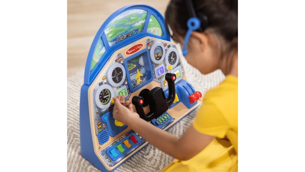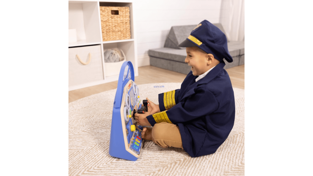 Melissa & Doug Jet Pilot Dashboard dvignejo svoj čas igranja na nove višine.Bodoči piloti se lahko pripravijo na vzlet s tem interaktivnim instrumentnim panelom, ki vključuje luči, gumbe, predvajanje zvoka, štiripoložajno ročico za plin in še več. Otroci lahko zavrtijo krmilno ukrivljenost, da premikajo mini letalo na drsni prikazovalnik.