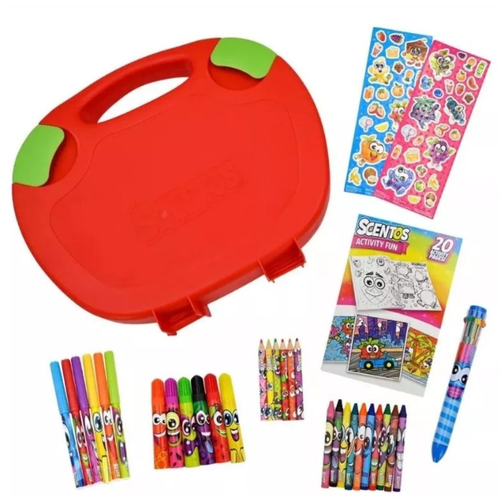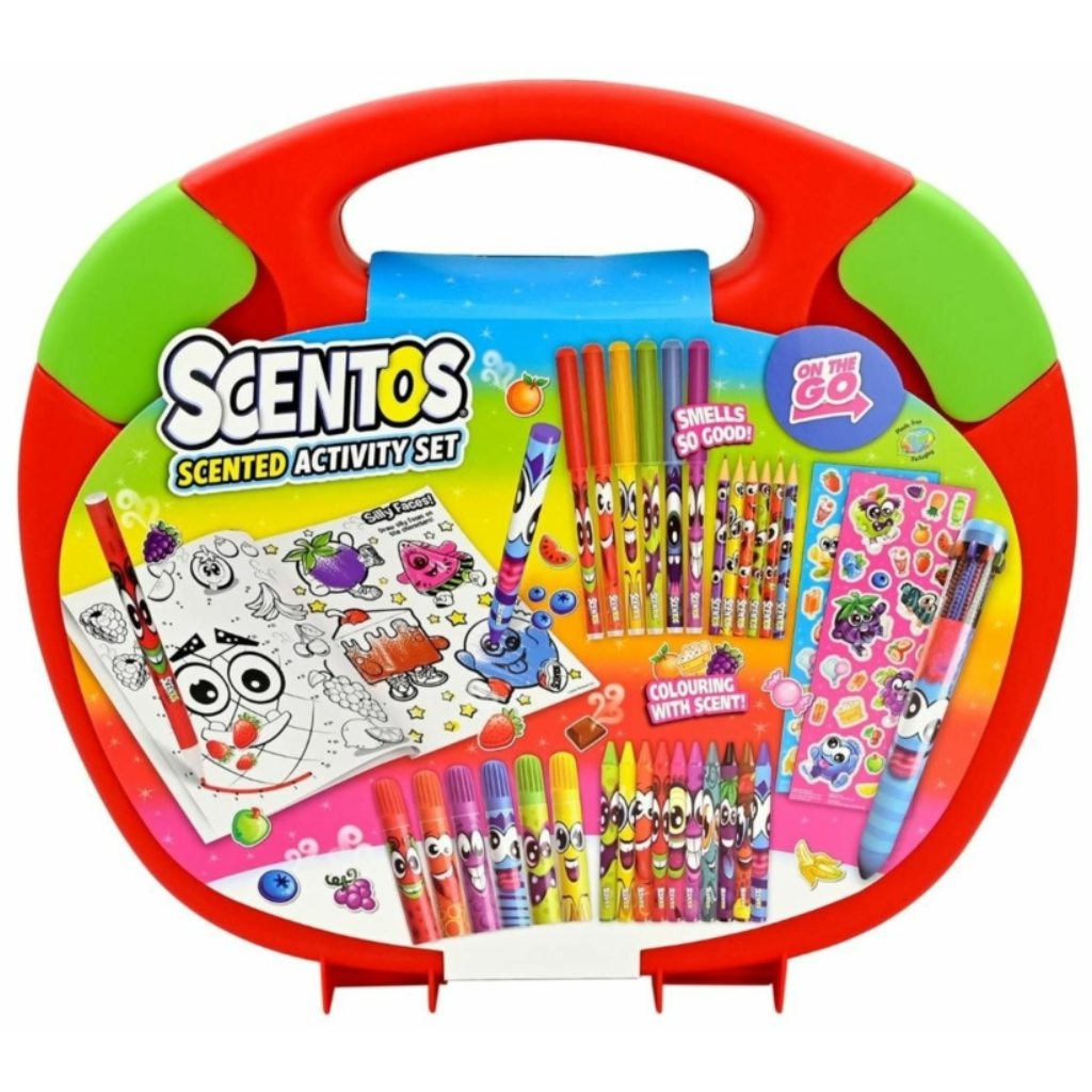 Scentos dišeči potovalni risalni komplet je popoln ustvarjalni paket, posebej zasnovan za ustvarjanje na poti. Praktičen kovček z ročajem vsebuje vsa potrebna orodja, zato lahko otroci kjerkoli – v avtu, na počitnicah ali med čakanjem – prosto rišejo in barvajo. Posebnost je v tem, da ima vsako orodje nežen sadni vonj, ki ustvarjanje še bolj prijetno.