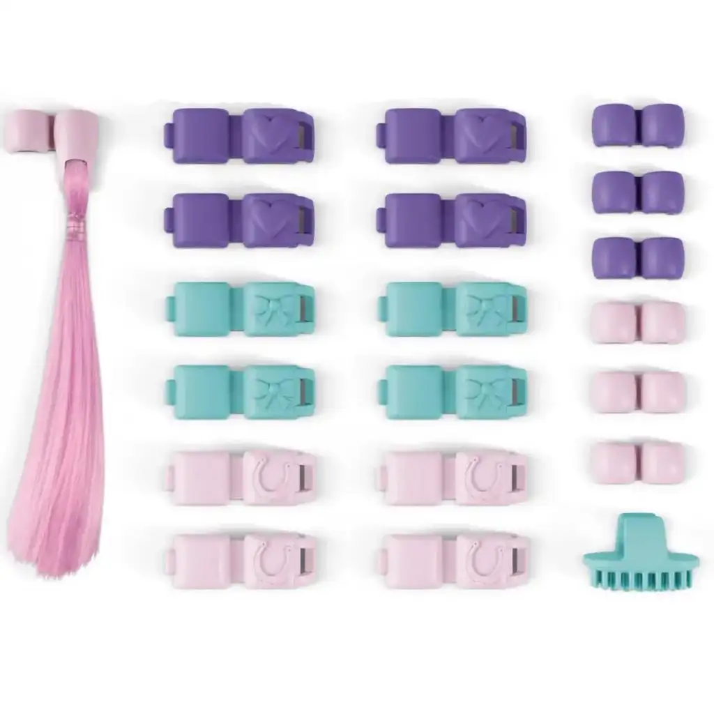 Paket vsebuje čudovit, roza zamenljiv rep in številne majhne okraske za lase, s katerimi lahko okrasijo grivo konjev. Različne barvne in vzorčne sponke, pentlje in okraski s podkvami pomagajo, da vsak konj dobi edinstven slog. Dodatki so enostavno pritrjeni in odstranjeni, tako da lahko otroci znova in znova preoblikujejo figure.
