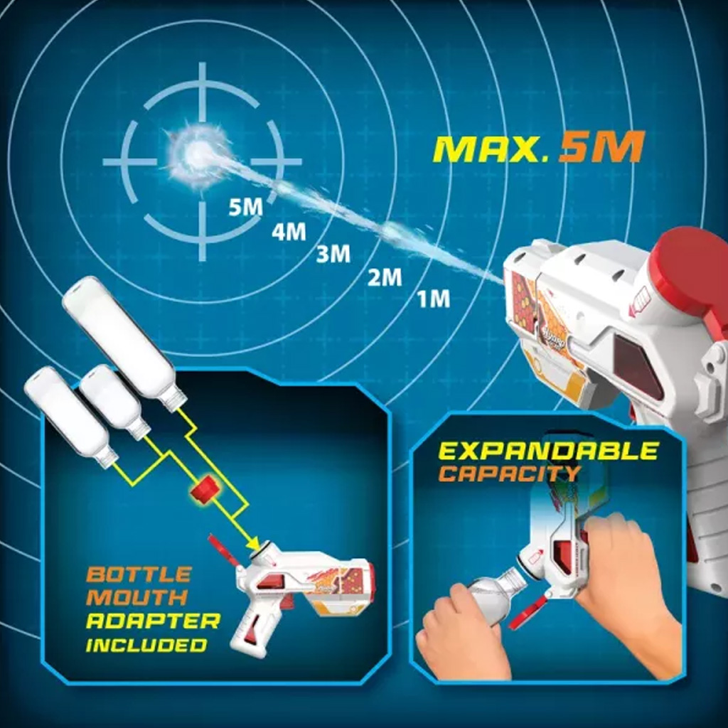 Praktičen adapter za priklop steklenice omogoča priklop različnih velikosti steklenic, tako je zmogljivost rezervoarja po potrebi razširljiva. To je še posebej uporabno pri daljših igrah, ko želimo redkeje polniti. Lahka, ergonomska oblika zagotavlja dober oprijem, zato lahko otroci igrajo dlje časa udobno.