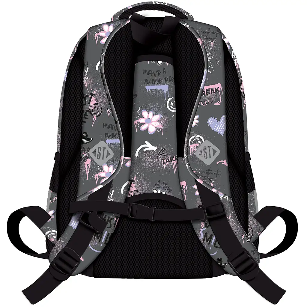 Siva šolska torba St.Right Good Vibes BP58 je odlična izbira za vse učence, ki imajo radi kul, edinstven slog in dodatke, ki izžarevajo pozitivno energijo. Sivi osnovi nahrbtnika dajejo živahen videz rožnati in vijolični napisi v grafitnem slogu, rože in srčki, v ospredju pa izstopa vesel napis »Good Vibes«, ki zagotovo polepša vsakdan.
