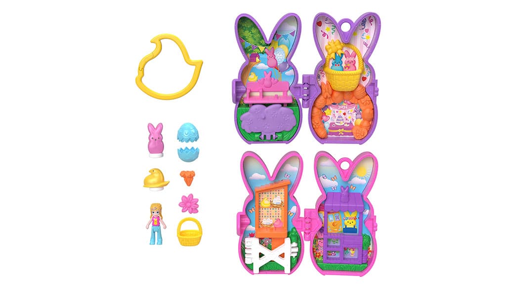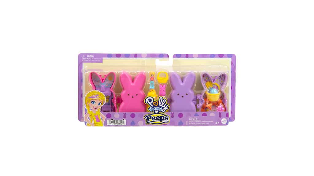 Vsak paket vsebuje dva igralna kompleta, ki izgledajo kot majhne, pisane figure Peeps in se odpirajo kot kompaktna ličila, razkrivajoč svet Polly Pocket s temo Peeps. Otroci lahko najdejo lutko Polly Pocket, oblačila in dodatke v notranjosti vijoličnih in roza izdelkov. Ta dva sta čudovita kombinacija jajc — otroci lahko uživajo v pomladni zabavi in dodajo svoji zbirki Polly Pocket preostanek leta (in še dlje). Čeprav izgledajo dovolj dobro, da bi jih želeli pojesti, ti igralni kompleti niso užitni.