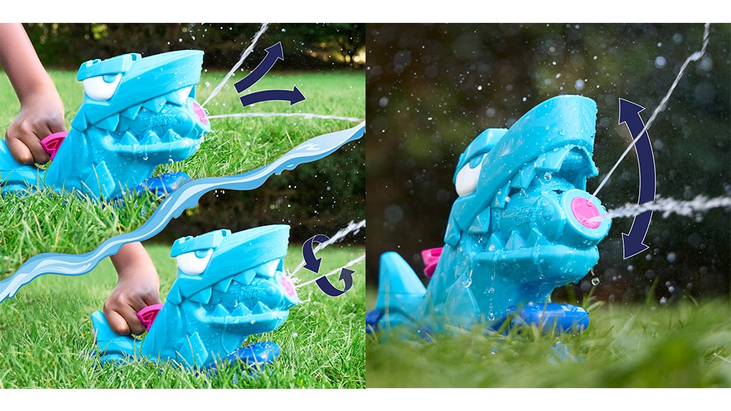 NERF Super Soaker Hop & Chomp je fantastična vodna igrača za otroke od 3. leta starosti. Posebnost igrače je, da ima zalivalno glavo v obliki morskega psa, ki iz svojih čeljusti izstreli dva curka vode, medtem ko izvaja grizne gibe, tako da vodna pršila vedno pridejo presenetljivo.