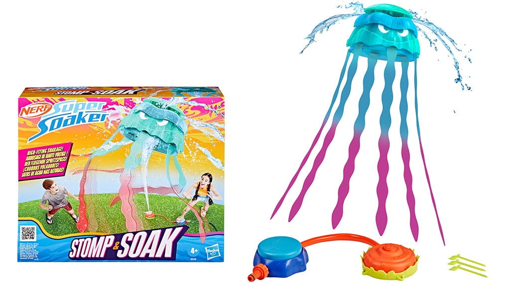 Izdelek Super Soaker Stomp & Soak je posebej zasnovan za otroke od 4. leta starosti naprej. Igra vključuje meduzo, ki jo lahko s pomočjo izstrelitvene ploščadi izstreliš v zrak, medtem pa iz vrha zvona meduze brizgajo vodni curki. Tudi lovke meduze škropijo vodo v vse smeri, kar naredi igro še bolj razburljivo. Samo priključi izstrelitveno ploščad na delujočo vrtno cev in Super Soaker Stomp & Soak bo že poskrbel za zabavo! Ta igrača je popolna izbira za poletne vodne bitke in zagotovo popestri vrtne zabave ali družinska srečanja.