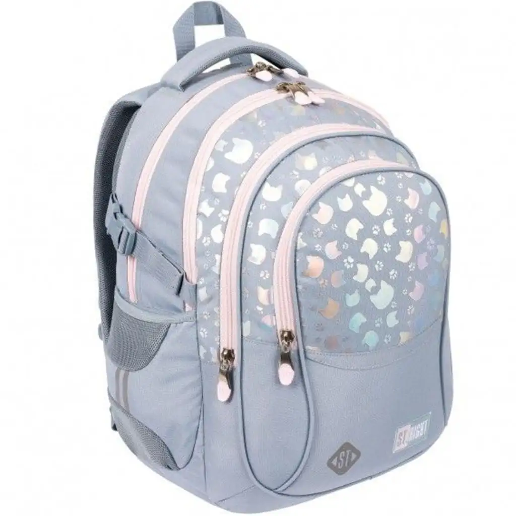 Šolska torba St.Right Silver Cats združuje funkcionalnost in eleganco v edinstvenem slogu. Okrašena je s sivimi vzorci mačjih glav in tačk, kar ji daje prefinjen, a hkrati ljubek videz.