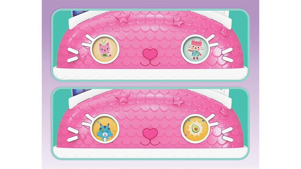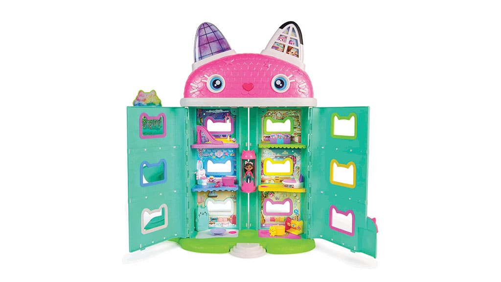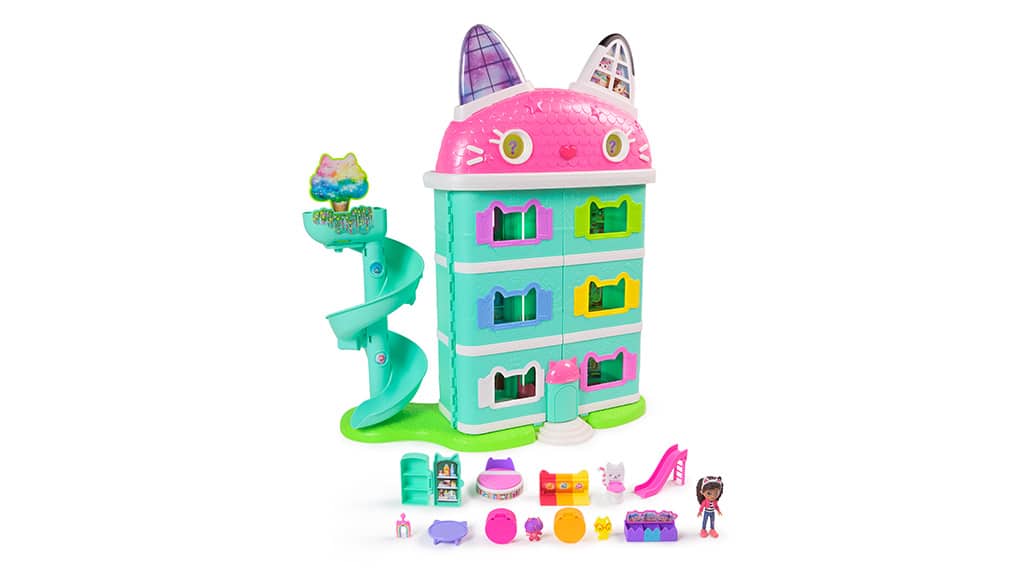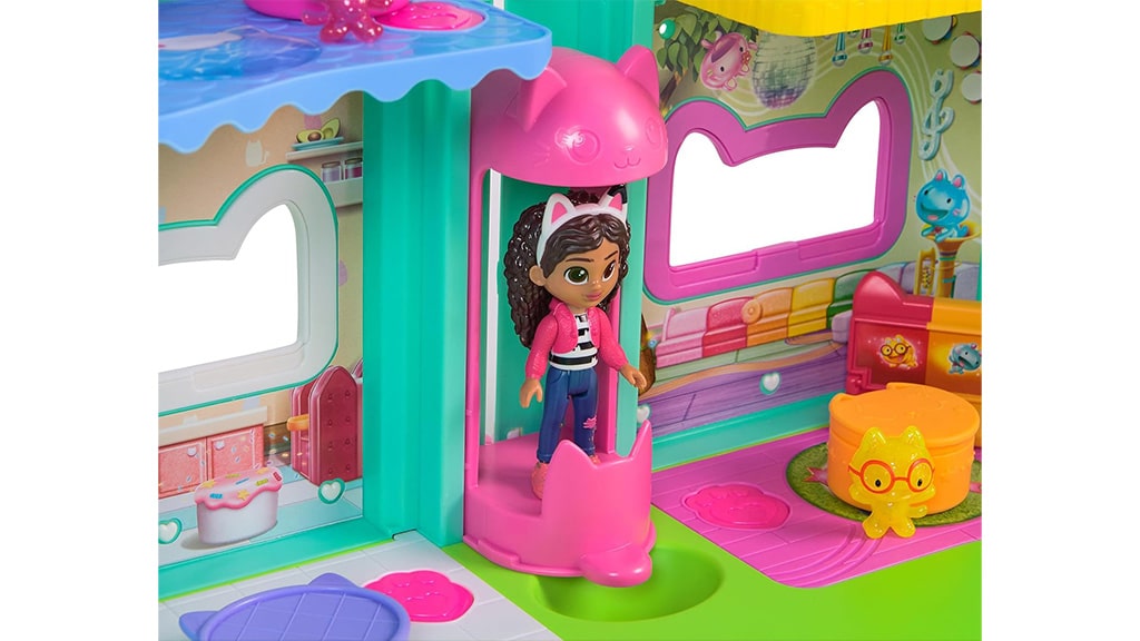 Spin Master oživi svet Gabijine čarobne hiše z Gabijino hišo Meow-mazing Interaktivno hišo za punčke! Ta hiša za punčke je višja od 60 cm in ima sedem interaktivnih sob. Med posebnostmi hiše so animirane LCD-oči, Cat-a-Vator dvigalo in spiralni tobogan, ki naredijo igro še bolj razburljivo.Malčki lahko skupaj odkrijejo šest načinov igre, vključno z dvema zabavnima igricama: Dnevna muca in Poišči! Če pritisnejo gumb za mačji nos na strehi ali gumbe Paw Bump Magic na posameznih nadstropjih, se aktivirajo različne animacije in presenečenja.