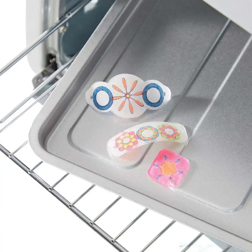 Set vsebuje vse, kar potrebujete za izdelavo spiralnih čarov. Z dobro znano metodo Spirograph otroci najprej narišejo vzorce na posebne, toplotno skrčljive liste. Za to lahko uporabijo gumijaste obroče, ki trdno držijo list na mestu, medtem ko s pomočjo šablon ustvarjajo osupljive spirale in oblike. Set vključuje 7 neon barvnih sestavin, s katerimi bodo vzorci resnično izstopali.