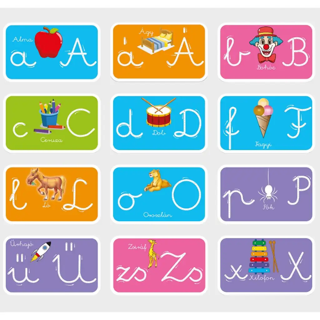 Paket vsebuje 12 dvostranskih, izbrisljivih kartic, ki otroke seznanjajo s črkami madžarske abecede. Poleg vadbe velikih in malih črk je na vsaki kartici vesela ilustracija in povezana beseda, na primer "A" kot jabolko, "B" kot klovn ali "Zs" kot žirafa. Priloženi izbrisljivi flomaster omogoča otroku, da znova in znova vadi pisanje črk, zato je komplet dolgoročno uporaben.