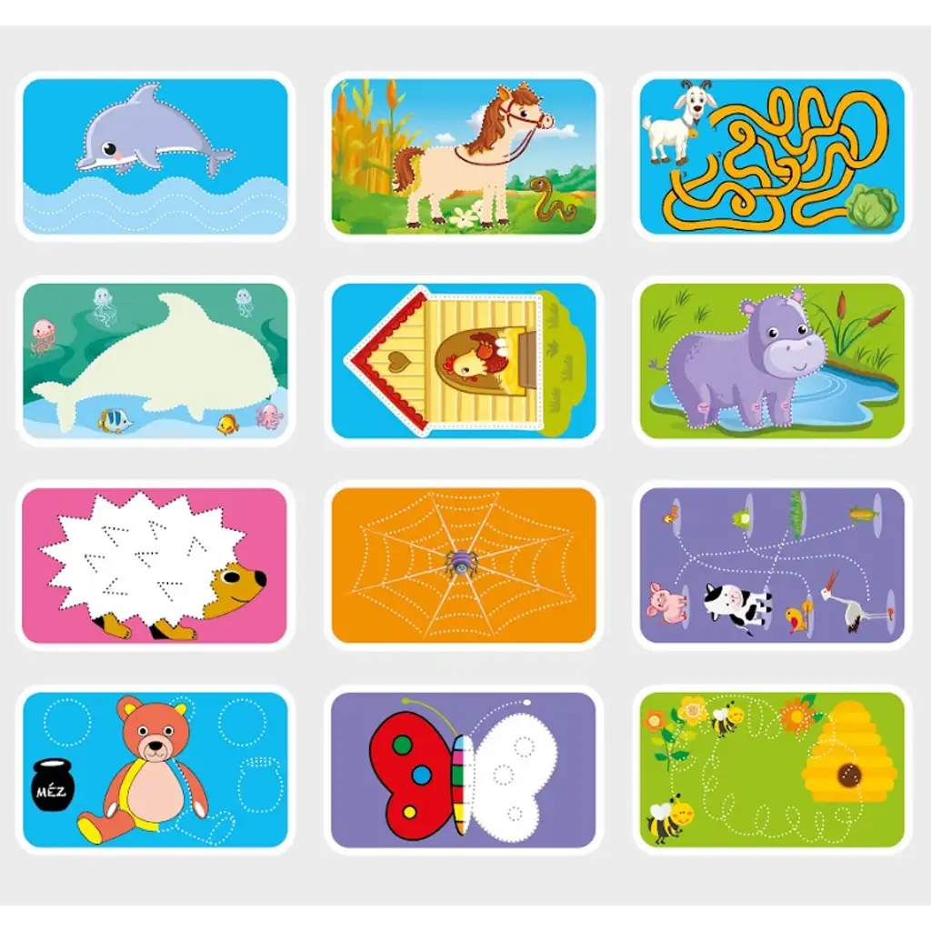 Ilustracije različnih živali, kot so delfin, konj, želva ali čebela, takoj pritegnejo pozornost otrok in jih spodbujajo k igri. Zaradi trpežne zasnove kartice dolgo zdržijo uporabo, medtem ko se otrok srečuje z novimi izzivi. Zaradi kompaktne velikosti so kartice idealne za potovanja, domačo igro ali celo vrtčevske dejavnosti.