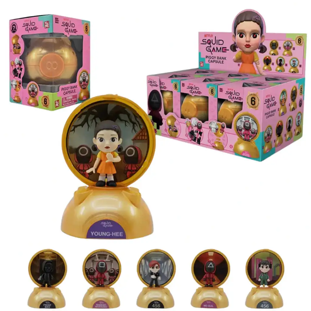 Če ste navdušeni nad eno izmed najbolj uspešnih serij na Netflixu, Squid Game, bo ta presenečenje kapsula s hranilnikom obvezen kos za vas! V ikonični zlati kapsuli hranilnika se skriva približno 7 cm visoka zbirateljska mini figura, ki postane vidna šele po odprtju – tako je vsak kos pravo presenečenje! Posebna kapsula ni le zabavna, ampak tudi praktična: njen vrh se lahko spremeni v stojalo, tako da figura dobi edinstveno ozadje in eleganten podstavek na vaši polici.
