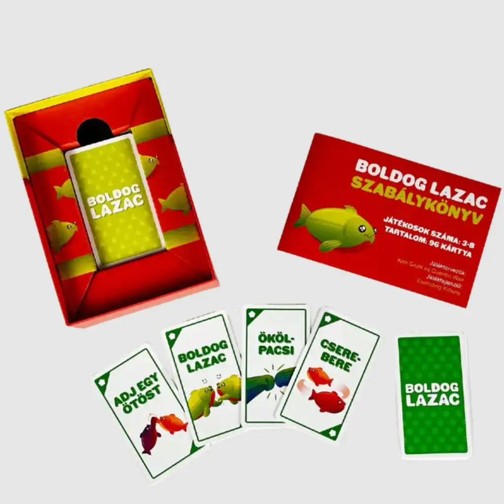 Igra vsebuje 96 kart z raznolikimi in zabavnimi nalogami za igralce. Pakiranje vključuje tudi pravila igre, ki pomagajo pri hitrem in nemotenem začetku igre. Pripravite se na noro in nepozabno izkušnjo, ki jo ponuja Srečni losos, in ki bo zagotovo nasmejala vse.