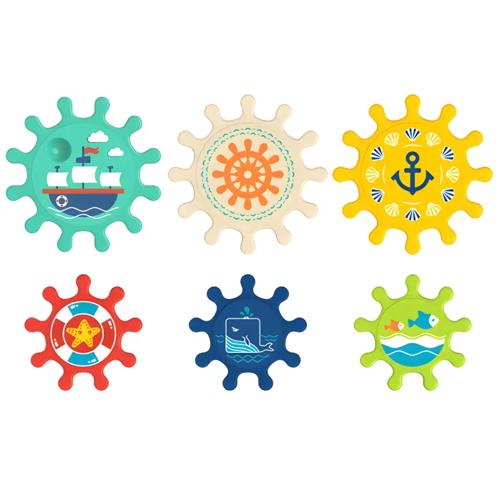 Vodni svet zobniške kopeli je zabavna in interaktivna igra, ki bo zagotovo popestrila rutino kopanja in spodbudila otrokovo kreativnost in sposobnost reševanja problemov. Komplet vsebuje 6 barvnih zobnikov različnih velikosti in barv, ki prikazujejo motive, povezane z morjem.