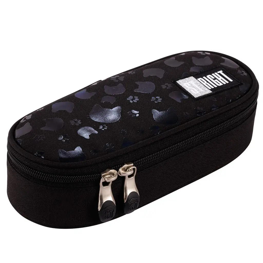 St.Right Black Cats ovalni peresnica je popolna izbira za vsakega osnovnošolca, ki ima rad stilske in praktične šolske dodatke. Ta peresnica se ponaša z elegantno črno barvo, okrašeno z diskretnimi, sijočimi mačjimi vzorci, kar ji daje resnično moderen videz.