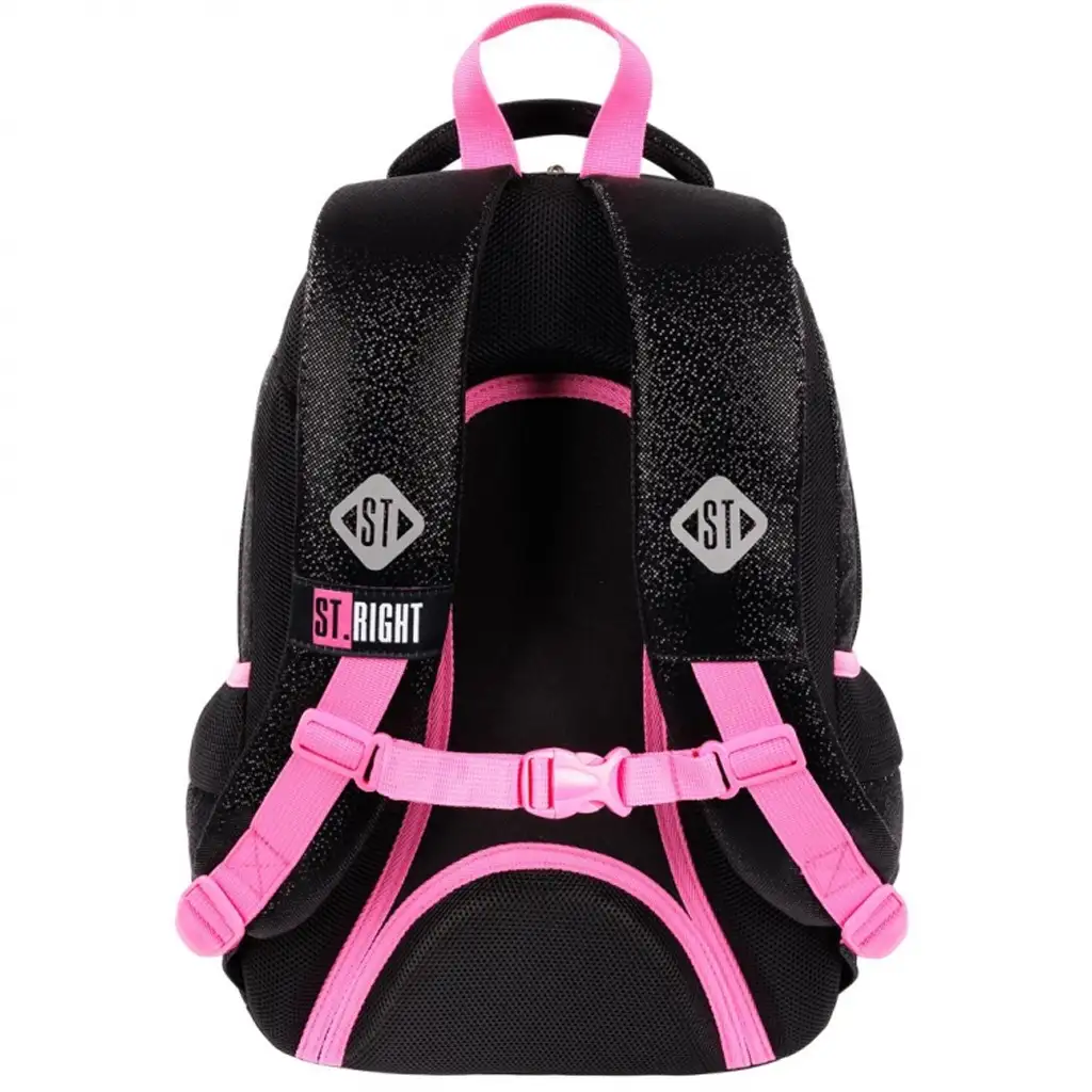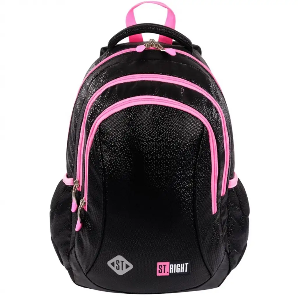 Šolska torba, nahrbtnik St.Right Black Glitter 39x27x17 cm je popolna izbira za tiste otroke, ki imajo radi eleganten, a hkrati trendovski videz. Glavna črna barva torbe je okrašena z drobnimi bleščečimi detajli, ki se nežno svetlikajo na svetlobi ter poudarjajo njeno edinstvenost in stil. Vpadljive rožnate zadrge, naramnice in okrasni elementi ustvarjajo kontrast, s čimer ta nahrbtnik postane res modni dodatek. Zaradi preprostega, a igrivega dizajna je odlična izbira tako za fante kot za dekleta.
