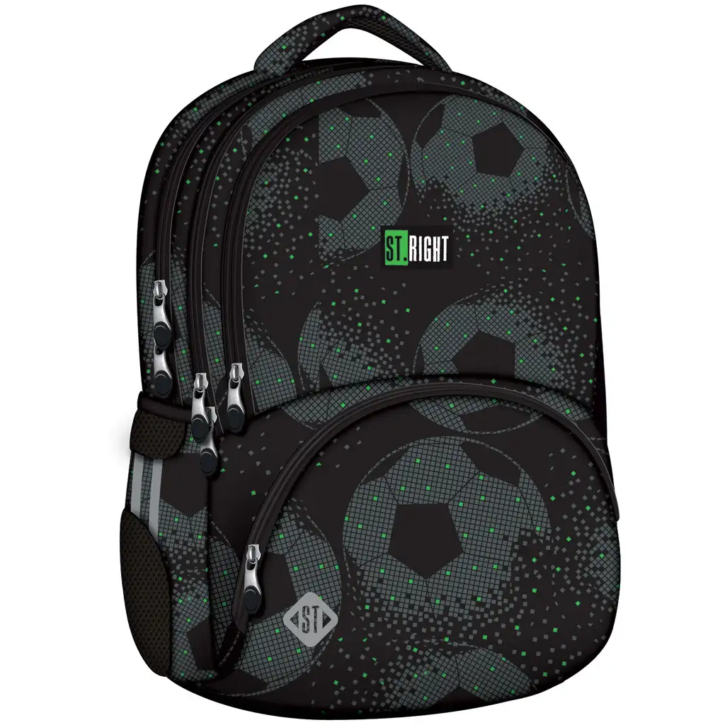 St.Right Football šolska torba BP07 je zasnovana v športnem in praktičnem dizajnu, idealna izbira za šolo ali druge dejavnosti. Vzorec s sivimi nogometnimi žogami na temni podlagi daje stilski in moderen videz.