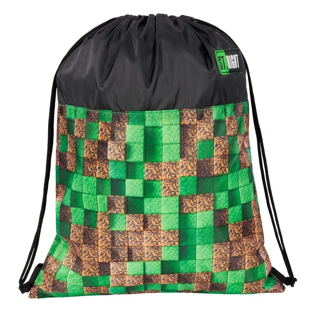 St.Right Pixel Cubes torba za telovadbo je modni in praktični dodatek, ki je idealna izbira za šolsko telesno vzgojo, športne aktivnosti ali vikend izlete. Njegova velikost je 43x34 cm, kar zagotavlja dovolj prostora za vse potrebne stvari. Torba za telovadbo ima resnično edinstven videz: zgoraj je črna, spodnji del pa je okrašen s pikseliziranim vzorcem, ki spominja na zemljo in travo, kar ponazarja srečanje narave in digitalnega sveta.