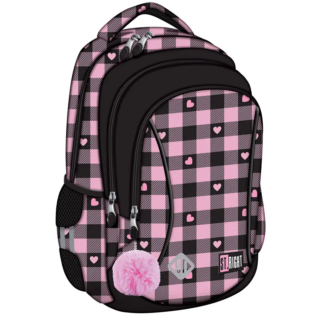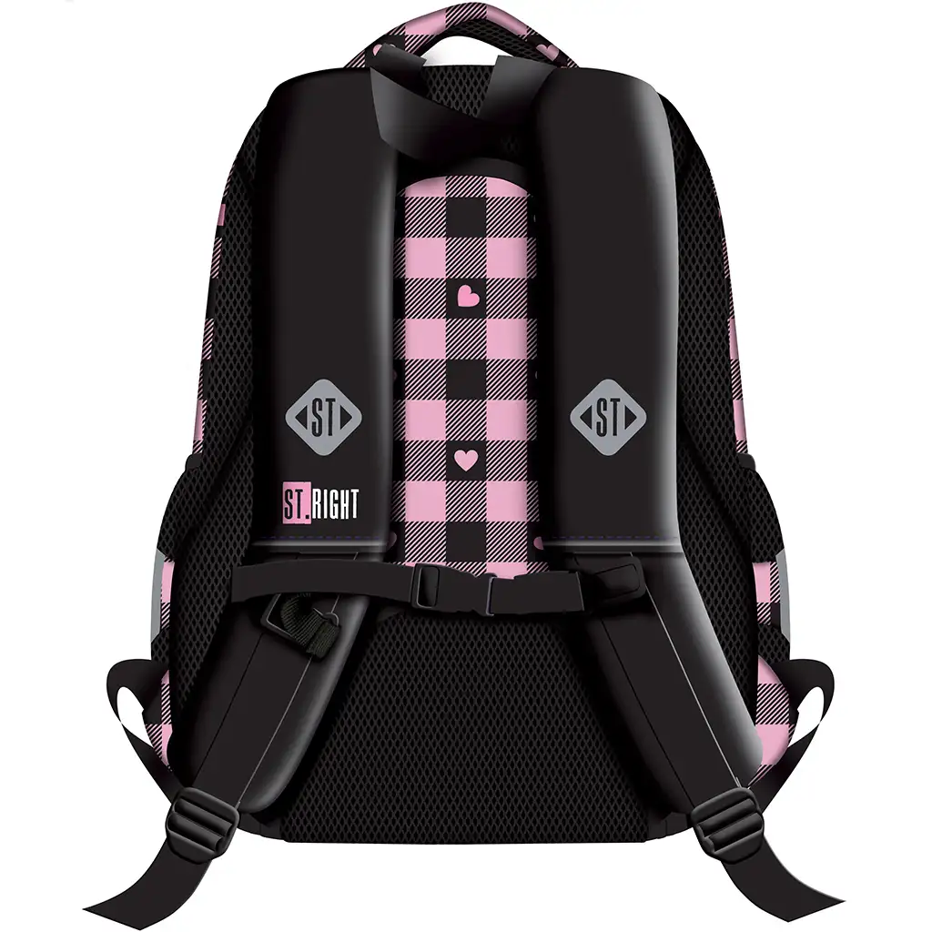 Šolska torba St.Right Pink-Black Heart BP26 je resnično čudovita izbira za vsako šolarko, ki ima rada simpatične, vendar hkrati praktične dodatke! Rožnato-črni karo vzorec krasijo majhni srčki, ki torbi dajejo vesel in edinstven videz. Mehka, roza cofka na sprednji strani doda nahrbtniku še bolj igriv in moden pridih.