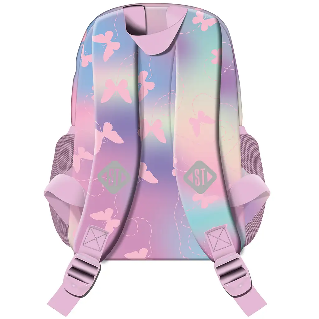 Nahrbtnik St.Right BP70 s roza metulji je sanjska izbira za vsako deklico, ki ima rada nežne, čarobne barve in prikupne vzorce. Nahrbtnik krasijo roza in pastelni barvni prehodi, subtilni metulji in majhne risbe, ki ustvarjajo igrivo in pravljično vzdušje. Svetli rožnati detajli, kot so zadrge in naramnice, še poudarjajo ljubkost torbe.