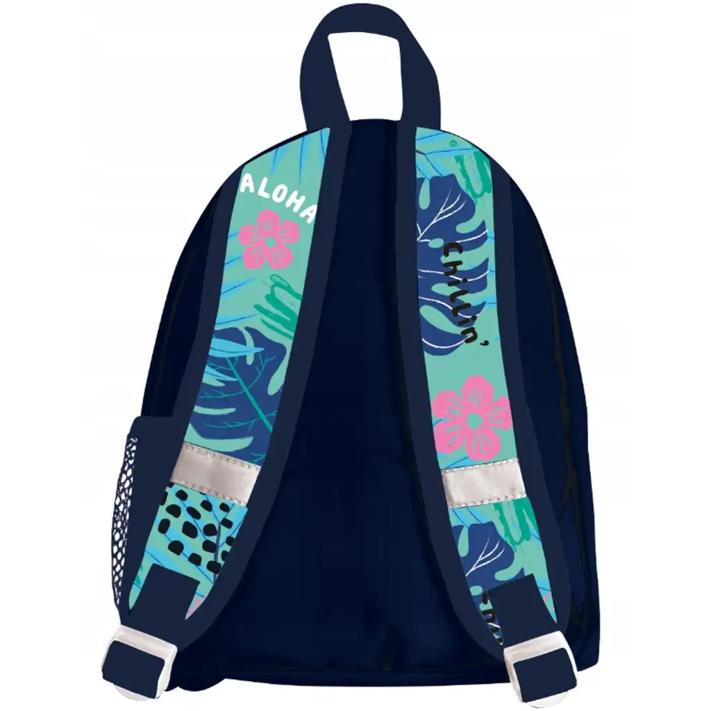 Nahrbtnik ima dva predala z zadrgo, zato lahko otroci svoje stvari preprosto in pregledno organizirajo. Udobne, podložene naramnice so nastavljive, tako da se nahrbtnik popolnoma prilagodi otrokovim meram. Na naramnicah so tudi odsevni trakovi, ki skrbijo za varnost v slabših svetlobnih pogojih. Hrbtna stran in naramnice imajo prav tako vesel, tropski vzorec, zato je nahrbtnik z vseh strani igriv in izstopajoč.