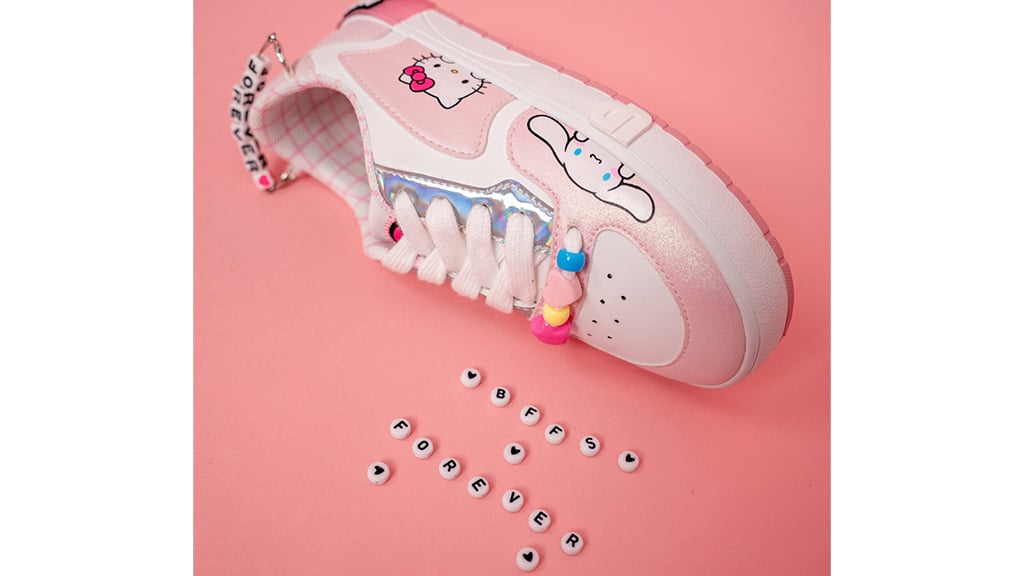 Tako kot Hello Kitty, tudi ti čevlji govorijo o prijateljstvu. Na peti čevljev, okrašenih s podobami prijateljev Sanrio, so dodatki v obliki zapestnic prijateljstva. Na vsakem čevlju je tudi zapestnica z napisom »Forever«, ki se nahaja nad črkami z napisom »Hello Kitty and Friends«. Na vezalkah športnih copat so barviti obeski v obliki srčkov in zvezdic, ki so okrašeni z biseri, kar naredi videz še bolj igriv in prijazen. Ti čevlji so popolni za vse, ki imajo radi vesel, prijateljstvu posvečen slog in bi radi svoje najljubše Sanrio like nosili tudi v vsakdanjem življenju.