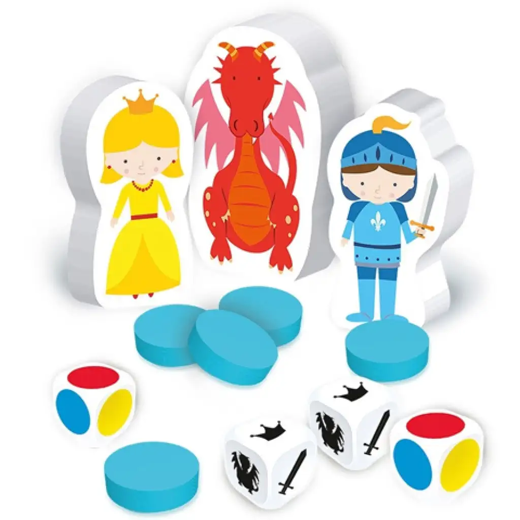 Iščete prvo družabno igro za svojega otroka, ki zagotavlja dobro voljo in zabavo? Ta igra je lahko odlična izbira zanj, saj ga popelje v pravljično igro s princeso, zmajem in princem. Bistvo igre je, da po metanju kocke zgrabite ustrezno barvno figuro. Kdor je hitrejši, dobi nagradni žeton. Igro lahko igrate tudi z drugo kocko, na kateri so krona, zmaj ali meč, ki simbolizirajo figure. Tudi tukaj je bistvo igre enako. Pridobite jo in igra se lahko začne.