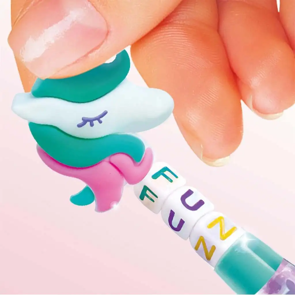 Osrednji del tovarne je praktični lijakasti dozirnik, s katerim lahko notranjost svinčnikov preprosto napolnijo z bleščicami, miniaturnimi okraski ali perlicami. S kompletom lahko izdelate 6 različnih svinčnikov, vključno z 2 označevalcema, zato igra ni le ustvarjalna, temveč tudi uporabna – izdelane svinčnike lahko takoj uporabljajo za risanje ali učenje. Vesele barve in prikupni motivi (mačke, samorog, tačka, jagoda itd.) bodo očarali vsakega malega ustvarjalca.