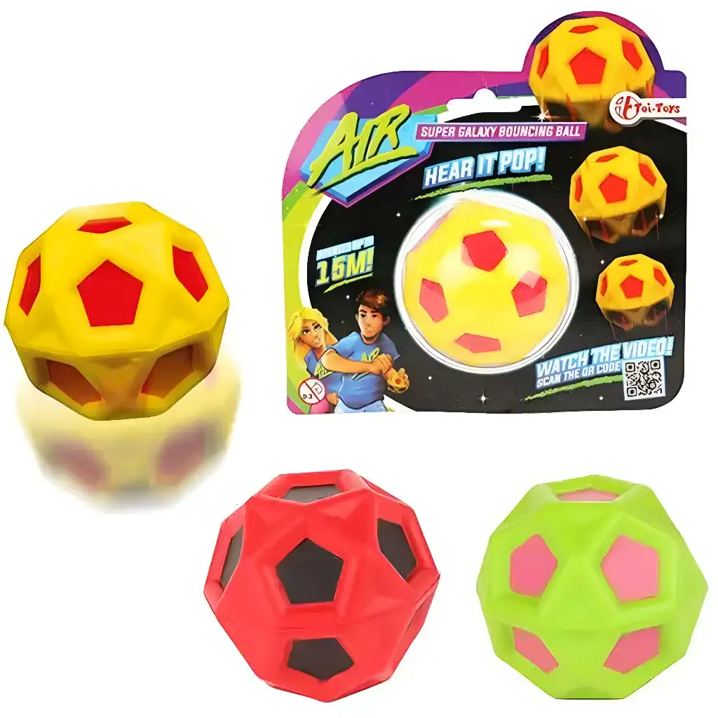 Pripravi se na super poskakajočo avanturo z žogo Toi-Toys Air Super Galaxy! Ta posebno oblikovana, pisana poskočna žoga ne samo, da lahko skoči neverjetno visoko – celo do 15 metrov – ampak ob vsakem udarcu odda tudi zabaven »pop« zvok, zaradi česar je igra še bolj zabavna. Idealna izbira za gibanje in aktivnosti na prostem.