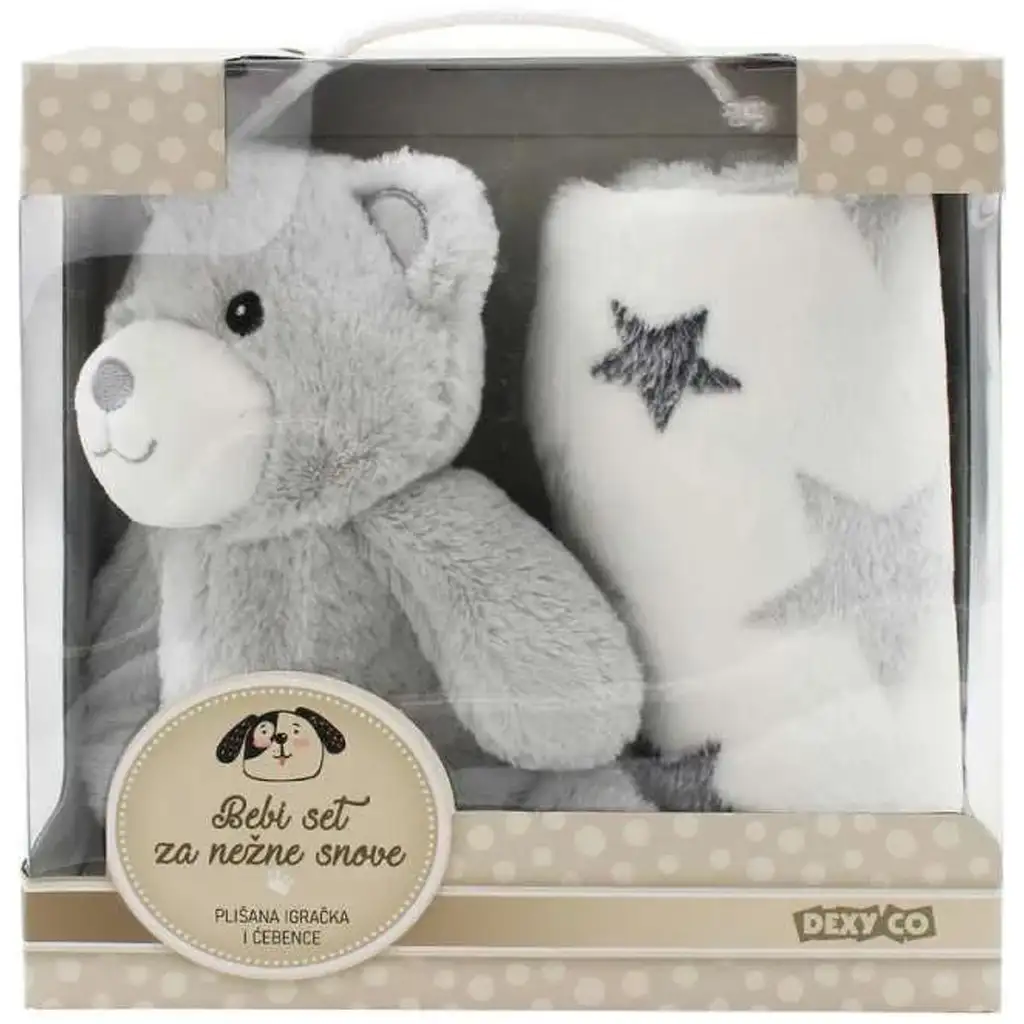 Sivi medvedek, ki je v kompletu, bo zagotovo prvi prijatelj malčka, ki bo vedno z njim med počitki, spanjem in v trenutkih, ko si zaželi objem. S svojim prikupnim, nasmejanim obrazom in mehkim dotikom daje občutek varnosti in otroku omogoča lažje sproščanje ter miren spanec. Odeja z belo osnovo in zvezdastim vzorcem pa spremeni posteljico ali voziček v pravi sanjski kotiček – njena mehkoba in toplina sta idealni v vseh letnih časih.