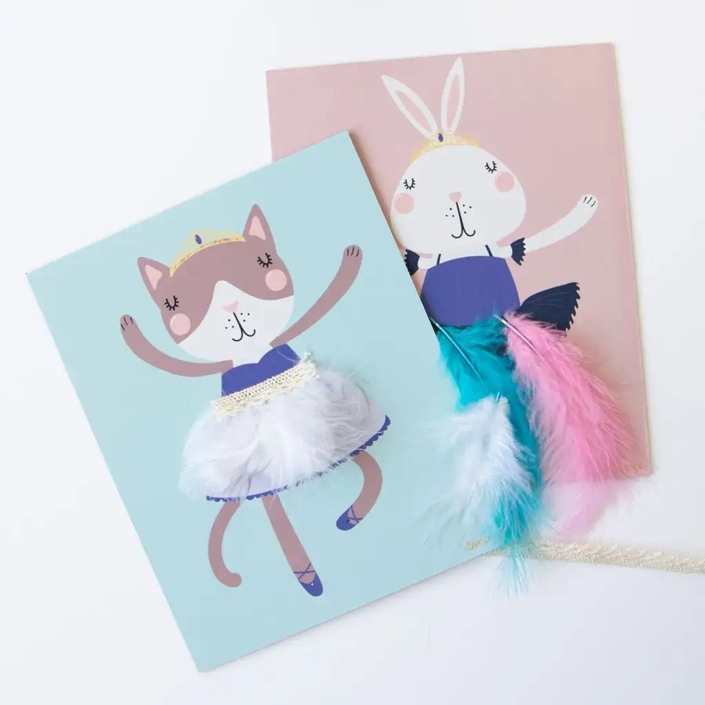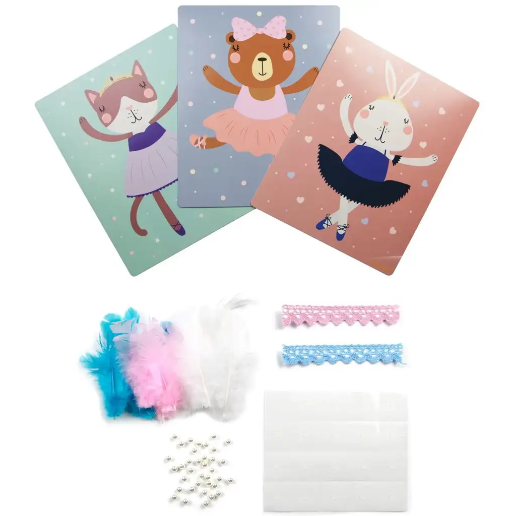 Komplet vsebuje vse potrebne materiale, od peres do kroglic in čipkastih trakov ter lepilnih pik, kar omogoča zabavno ustvarjalno popoldne. Naloga je preprosta: sledite vzorcu ali pustite otroku, da sprosti svojo domišljijo in okrasi male balerine v svojem slogu. Med ustvarjalnim preživljanjem časa se razvijajo fina motorika, ročne spretnosti, koncentracija in estetski čut.