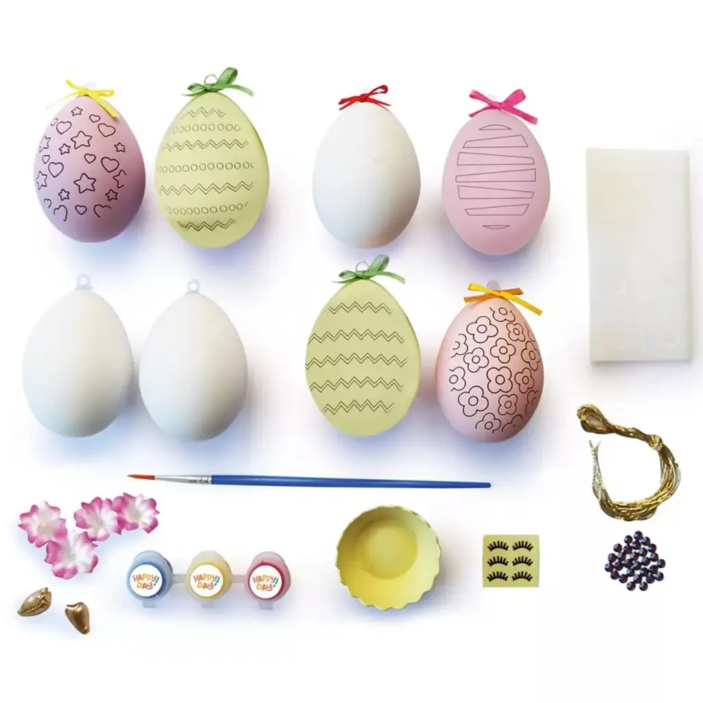 Jajca so enostavna za uporabo za otroke, in s priloženim čopičem, barvami in dekorativnimi elementi jih lahko popolnoma prilagodite. V kompletu so tudi predloge, ki dajejo ideje za ustvarjanje, tako da bodo otroci uspešni tudi, če se šele spoznavajo s svetom ročnih del. Jajca so opremljena tudi z obešalniki, tako da lahko končni izdelki postanejo okraski za velikonočne veje.