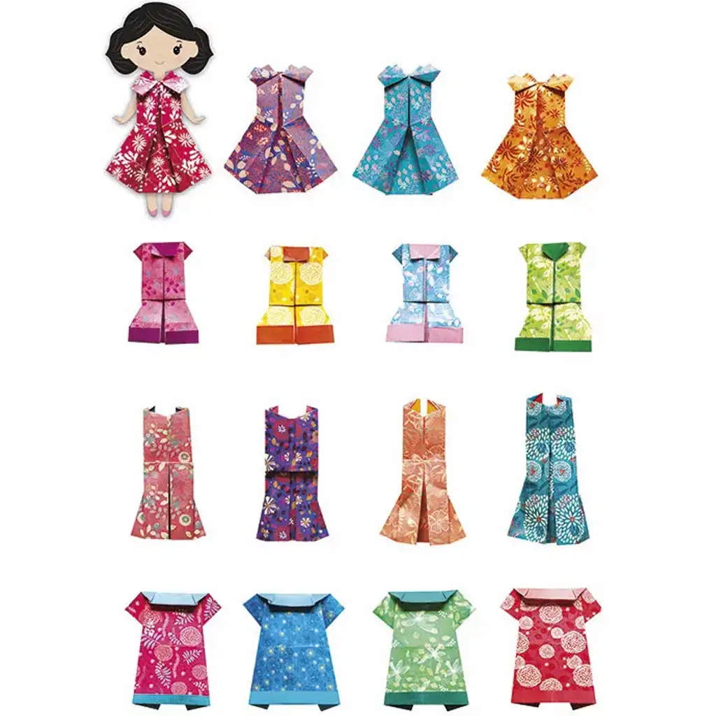 Paket vsebuje izrezano kartonsko lutko in različne čudovite vzorčaste papirje, iz katerih je mogoče enostavno zložiti različne kose oblačil. Vsako oblačilo ima edinstveno barvno shemo in stil, tako da lahko otroci ustvarijo pravo modno kolekcijo za punčko – od klasične večerne obleke do vesele poletne obleke. Ilustrirana navodila po korakih omogočajo enostavno učenje, tudi za tiste, ki se šele spoznavajo z origamijem.