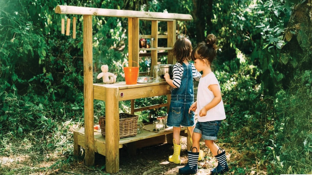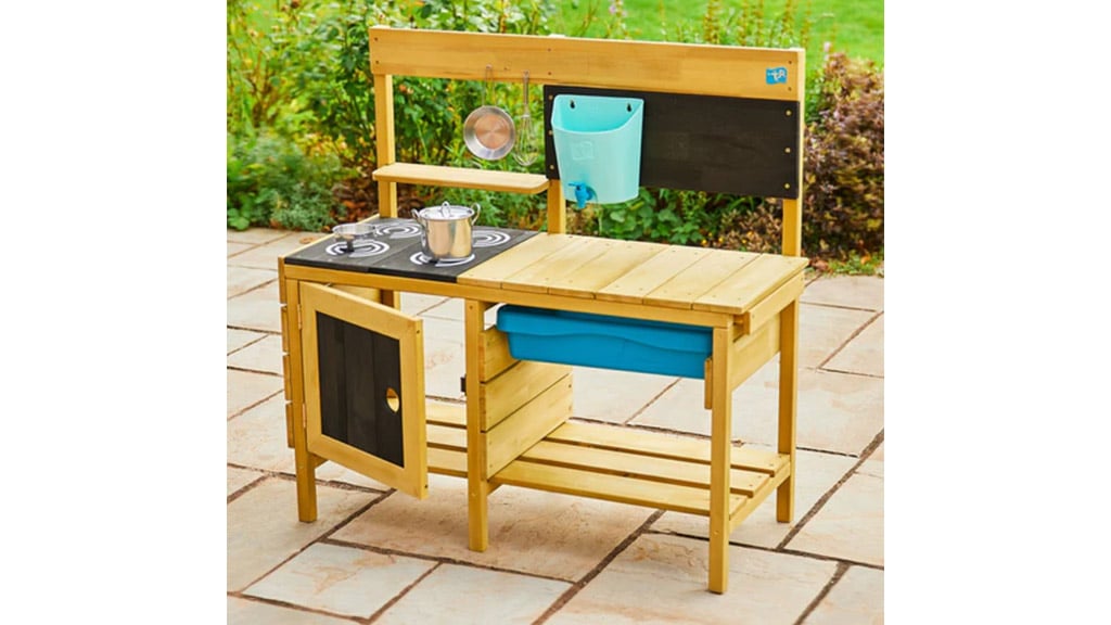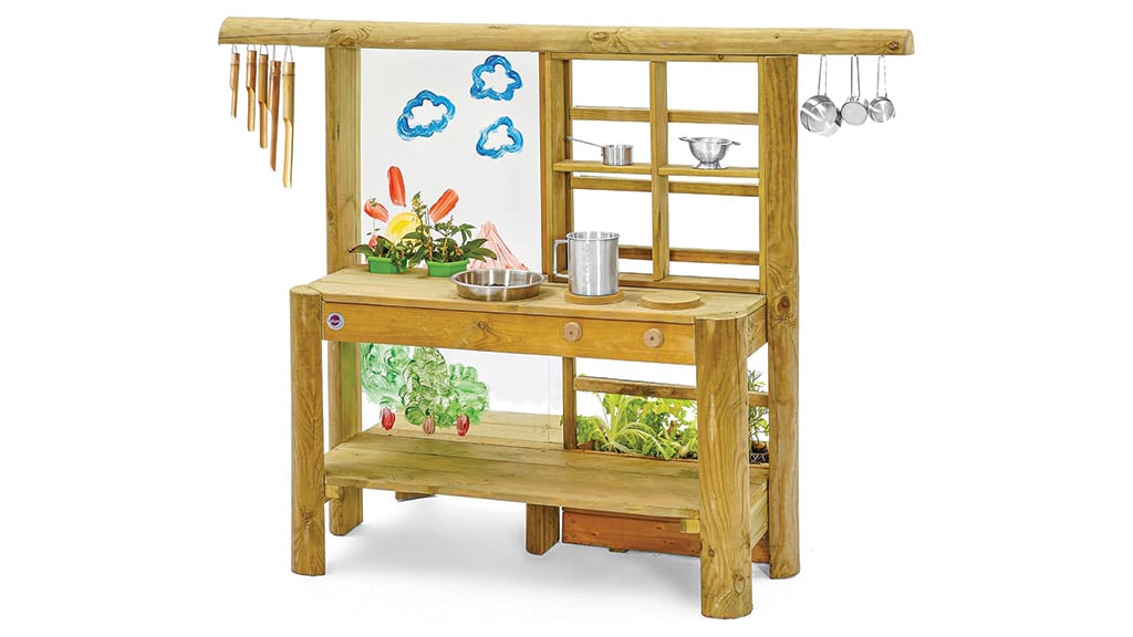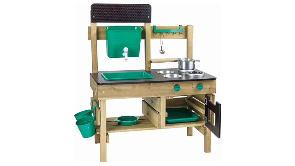 Ta igralni komplet vsebuje vse, kar otroci potrebujejo za kuhanje na prostem. V njem boste našli kuhinjske pripomočke, cvetlične lončke, rezervoar za vodo, pomivalno korito z delujočo pipo, pečico in jedilni meni na tabli za kredo. Otroška domišljija je brezmejna, zato je tudi izbira namišljenih jedi neskončna – lahko pripravijo na primer blatne pite ali kamnito juho. Ta komplet ne zagotavlja le zabave, temveč tudi ustvarjalni razvoj in igro vlog, medtem ko se otroci igrajo skupaj na svežem zraku.