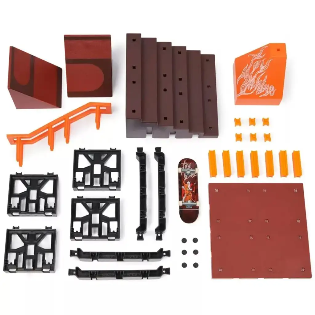 Set vsebuje stopnice, ograjo, nagnjene rampe in platformo v obliki piramide, ki so idealni za skoke, vrtenja in druge ustvarjalne gibe. Trdni, a enostavno združljivi elementi omogočajo otrokom, da prosto spreminjajo postavitev steze, zato jih vsakič čaka nov izziv. Komplet vsebuje tudi podrobno izdelan, kakovosten fingerboard, ki je popoln za učenje trikov – tako za začetnike kot za izkušene fingerborderje.