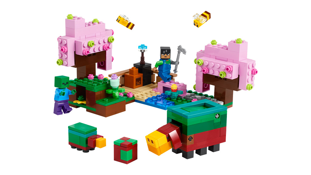Komplet Piratska ladja vsebuje 166 kosov in vključuje vozilo za sestavljanje, lignja, dve piratski figuri ter odraslo LEGO Minecraft kamelo. Komplet Češnjev cvet vsebuje 304 kosov in vključuje figuro Sunny, dve češnjevi drevesi ter odrasle in mlade Snifferje. Komplet Volčji grad vsebuje 312 kosov. Otroci lahko zgradijo celotno bazo, ki vključuje delovno mizo, talilno peč, nakovalo in kovaško mizo.