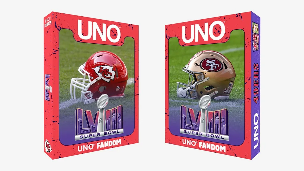 Končno, UNO LVIII Super Bowl Kartice vsebujejo slike igralcev ekip, prav tako pa vsak komplet vsebuje zbirateljsko folijsko kartico. Novi kompleti so del blagovne znamke Mattel Creations UNO Fandom, ki ponuja igre UNO za zbiratelje, izpostavljajoč zabavne blagovne znamke, športne ekipe in pop kulturo.