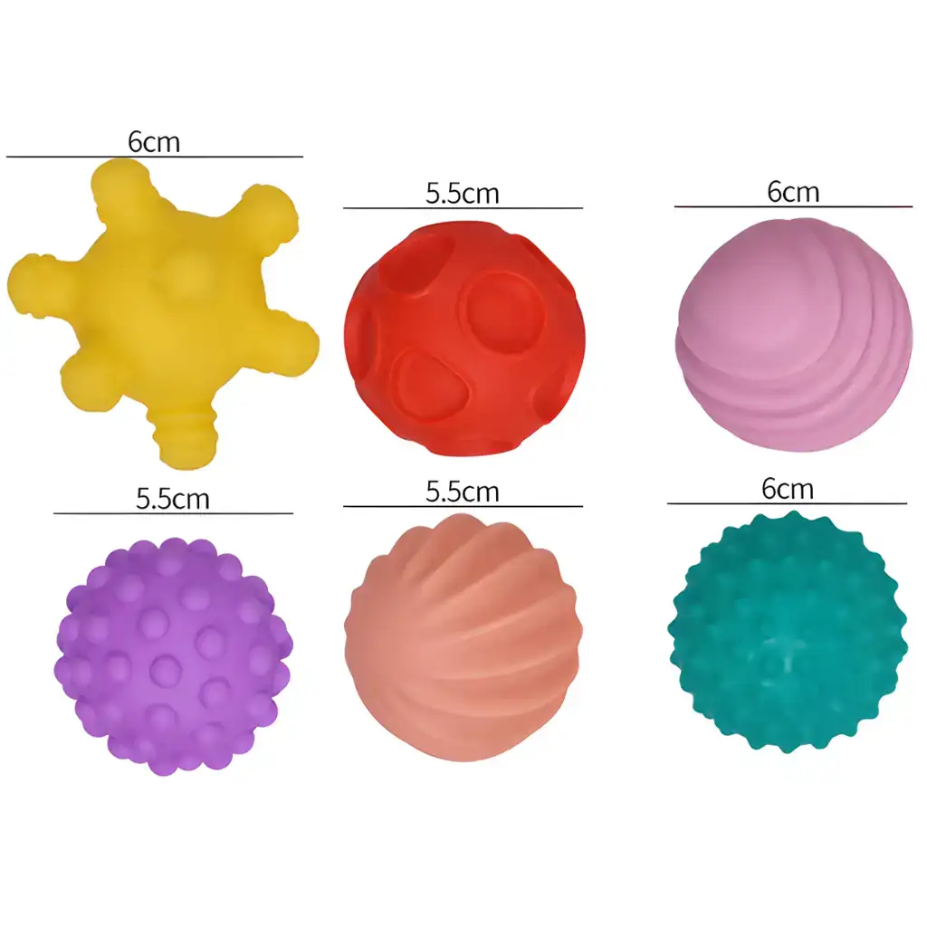 Komplet 6 žogic za razvoj tipa je idealna izbira za razvijanje taktilnega čuta in motoričnih spretnosti dojenčkov. Set vsebuje 6 žogic različnih barv in tekstur, velikosti med 5 cm in 6 cm, da jih lahko malčki enostavno držijo.