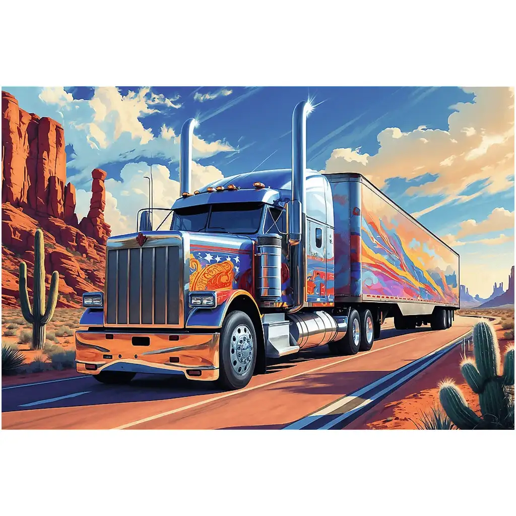 Če je tvoj otrok navdušenec nad močnimi stroji in razburljivimi potmi, bo Sestavljanka Tovornjak na cesti postal njegov novi favorit! Ta sestavljanka s 160 kosi prikazuje osupljiv poslikan tovornjak, ki potuje čez puščavsko, divjezahodno pokrajino pod sončnim nebom. Pogled na ogromni ameriški tovornjak, ki se blešči v kromu, je že sam po sebi impresiven, a barviti motivi na strani in celoten prizor pokrajine naredijo sestavljeno sliko še posebej doživeto.